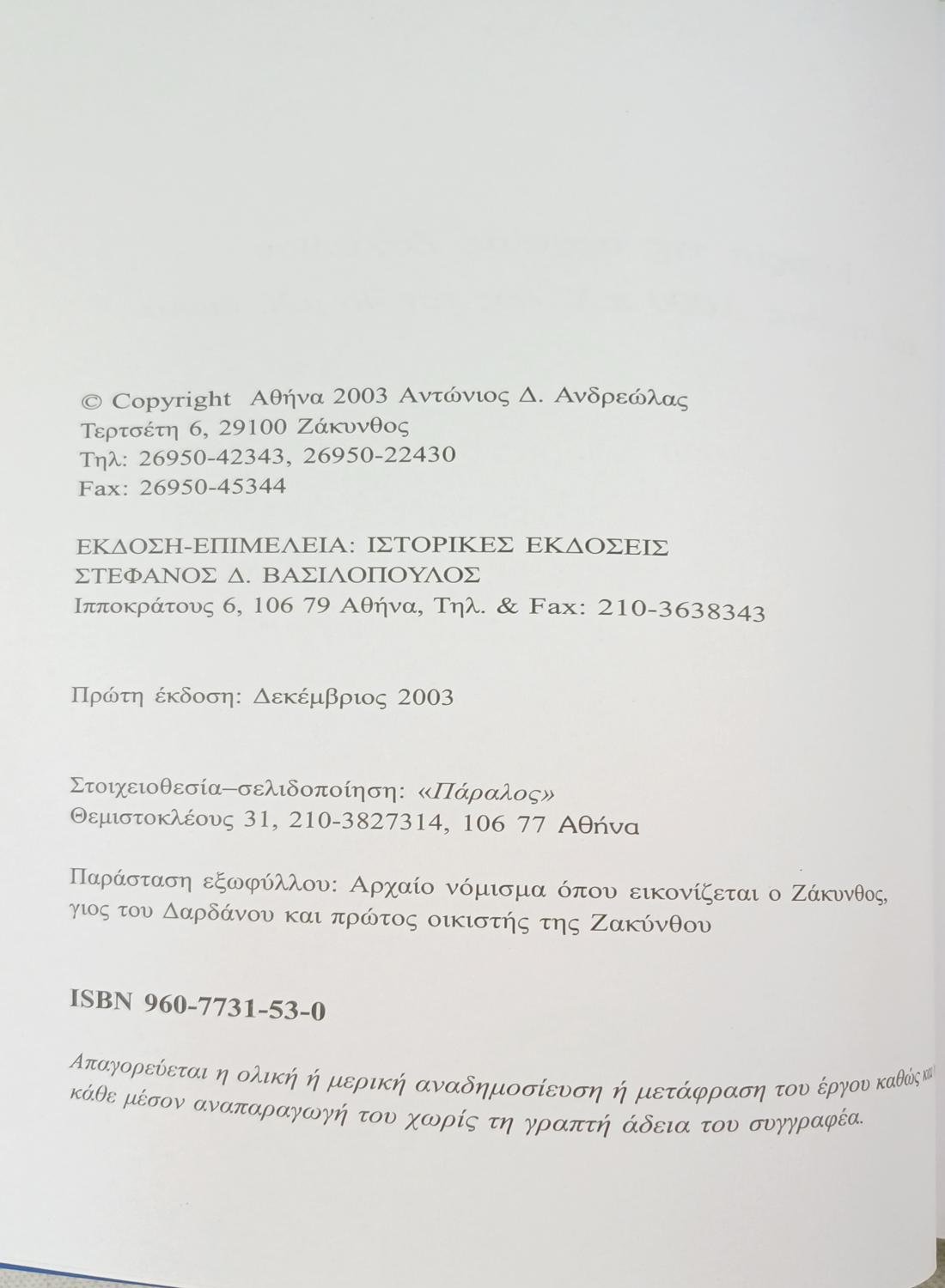 “Ιστορία της αρχαίας Ζακύνθου” Αντώνιος Ανδρεώλας (2003)