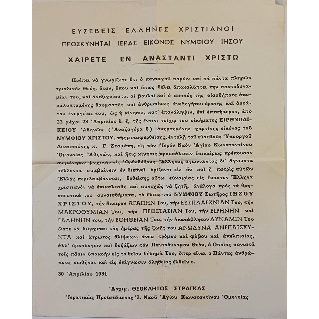 Ανακοίνωσις / κάλεσμα των ευσεβών χριστιανών της ενορίας του Ιερού ναού Αγίου Κωνσταντίνου Ομονοίας προς προσκύνηση θαυματουργού εικόνας του Ιησού Χριστού η οποία ευρίσκετο