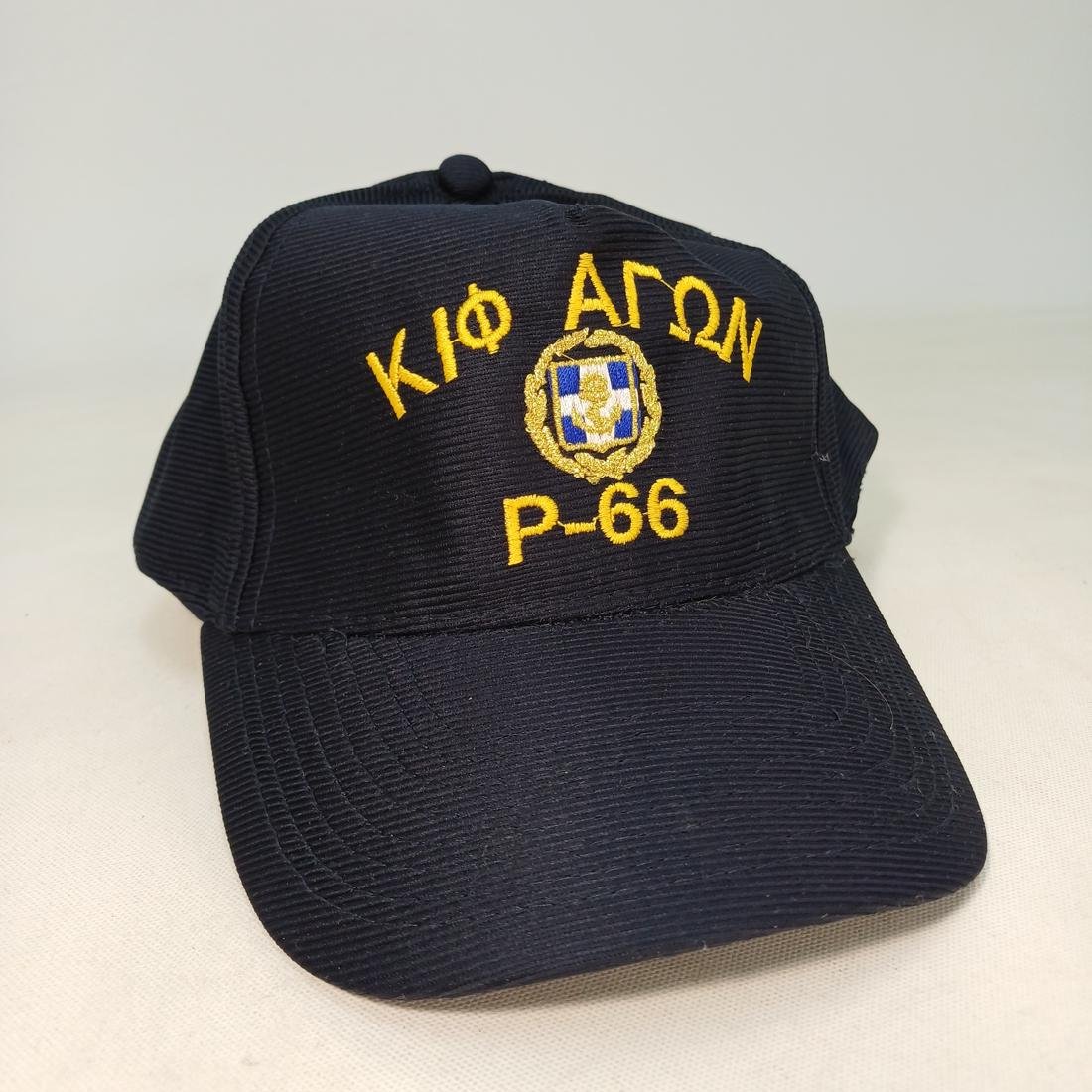 Καπέλο τζόκεϊ “Κ/Φ ΑΓΩΝ Ρ-66” του Ελληνικού Πολεμικού Ναυτικού, το οποίο ανήκει στο πλήρωμα της Κανονιοφόρου. Το συγκεκριμένο πλοίο αποτελεί μέρος της Διοίκησης Πλοίων Επιτηρήσεως και το καπέλο φέρει κεντημένο το εθνόσημο της Ελλάδας πλαισιωμένο από χρυσές δάφνες, καθώς και το όνομα και τον αριθμό του πλοίου με κίτρινη γραμματοσειρά.