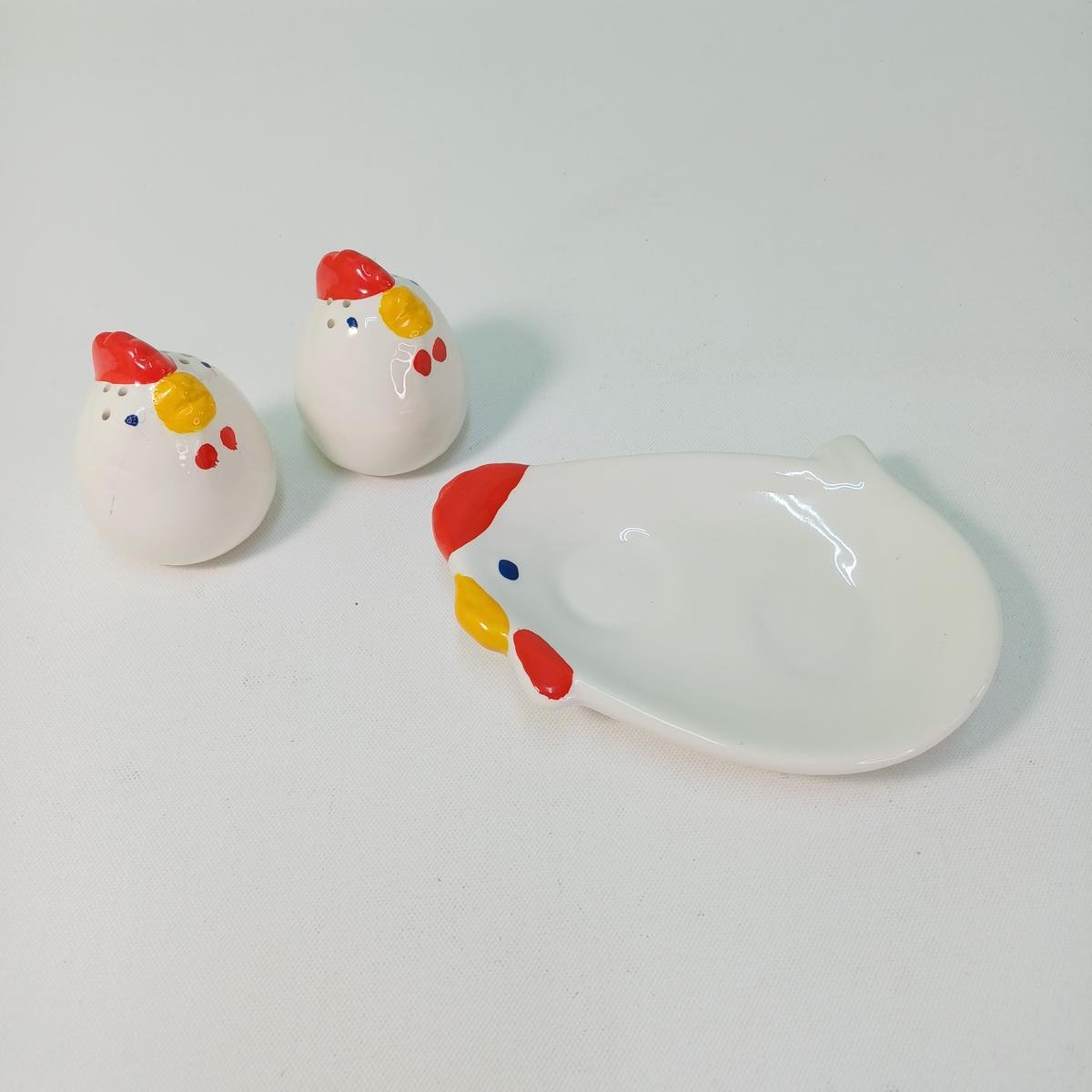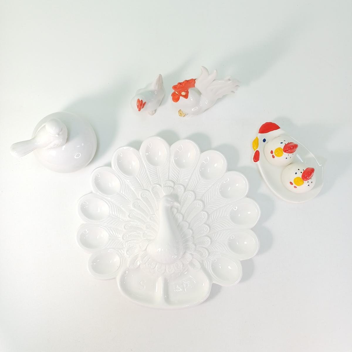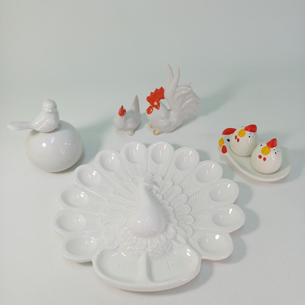 LOT 7 κεραμικών αντικειμένων για Πασχαλινή διακόσμηση τραπεζιού. Το LOT αποτελείται από: 1) ένα διακοσμητικό πουλί πάνω σε μπάλα, ύψους 14 cm και διαμέτρου 10 cm. 2) 1 πιατέλα για αυγά σε σχήμα παγωνιού και θέσεις για αλάτι και πιπέρι στο κάτω μέρος. Οι διαστάσεις της είναι 31 x 29 cm. 3) Διακοσμητικό ζευγάρι κόκορας- κότα (μέγιστου ύψους 15,5 cm). 4) Set αλατοπίπερο με πιατάκι σε σχήμα κότας. To πιατάκι έχει διαστάσεις 15 x 11 cm και το ύψος των αλατοπίπερων είναι 6,5 cm.