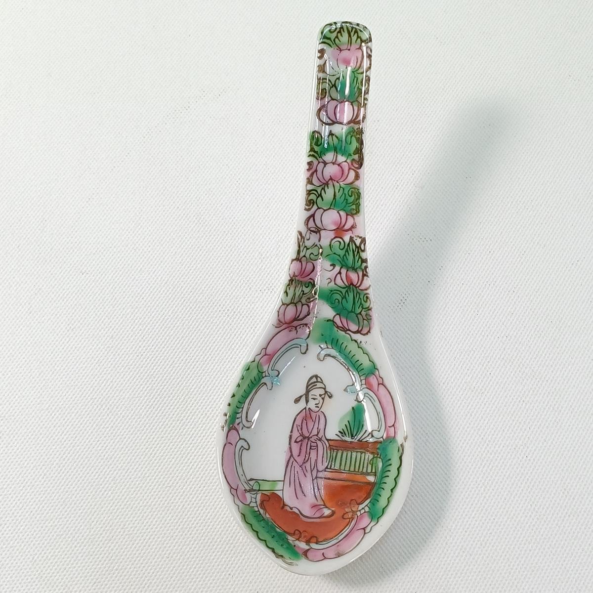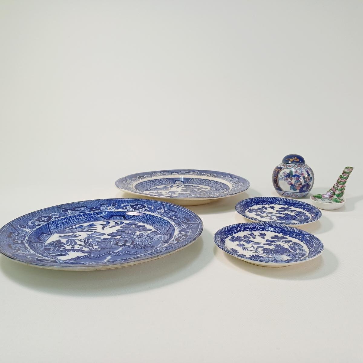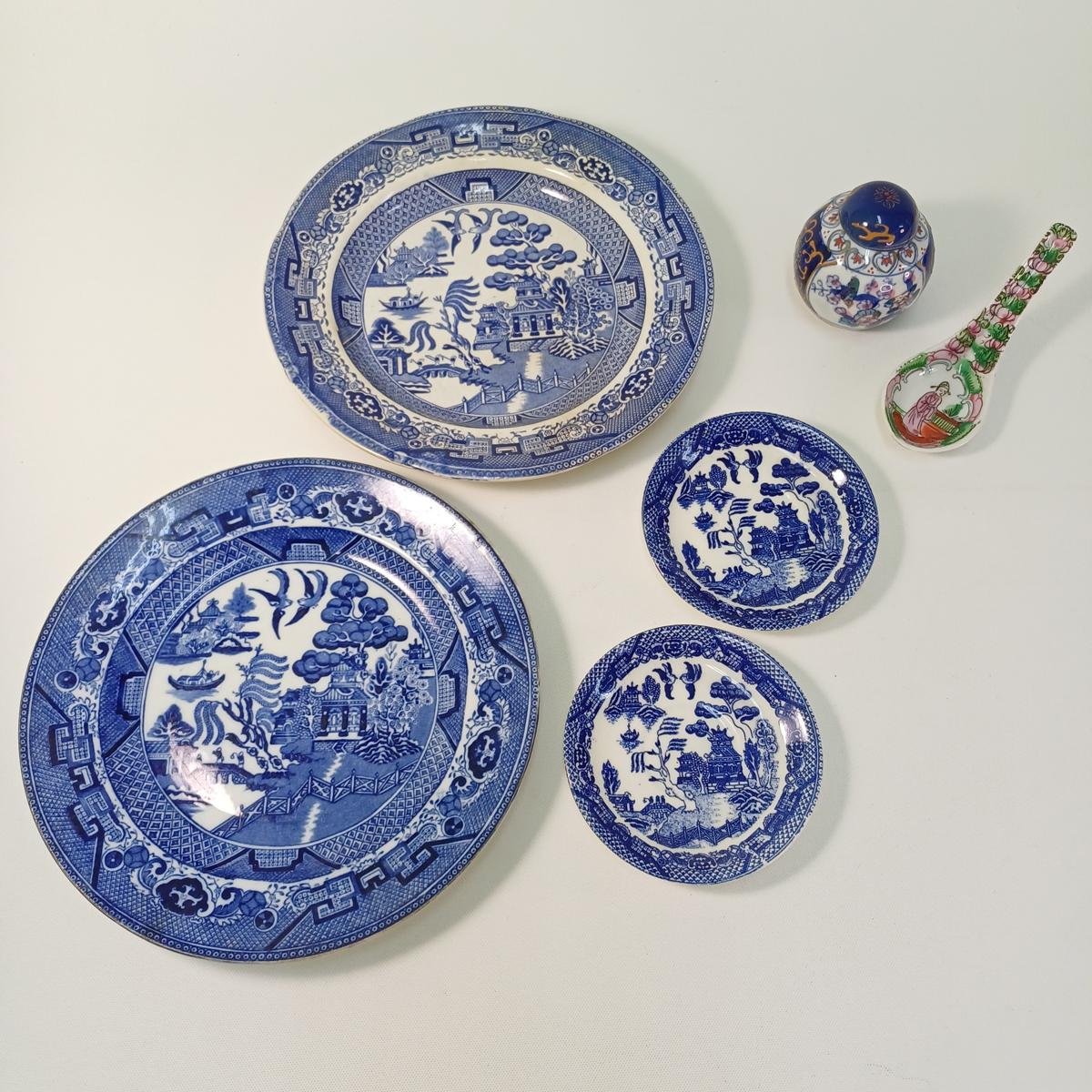 6 συλλεκτικά είδη σερβίτσιου με κινέζικο θέμα από πορσελάνη. Αποτελείται από: 1) 2 μεγάλα διακοσμητικά πιάτα αντίκες με κινεζικό θέμα. Το ένα πιάτο είναι από την εταιρεία George Jones της Αγγλίας. Πρόκειται για πορσελάνη σε μπλε και λευκό χρώμα, η ανάγλυφη σφραγίδα της οποίας υποδηλώνει την κατασκευή της τον 3ο μήνα του 1911. Τα χρώματά του έχουν κρατηθεί ζωηρά. Το δεύτερο πιάτο δεν φέρει σφραγίδες, έχει τα ίδια μοτίβα, αλλά τα χρώματα έχουν ξεθωριάσει περισσότερο και έχει ρωγμές. Η διάμετρός τους είναι 23 cm. 2) 2 πιατάκια του ίδιου κινεζικού θέματος τα οποία φέρουν μόνο σφραγίδα “High Quality”, έχοντας κρατήσει τα ζωηρά μπλε χρώματά του. Έχουν διάμετρο 11,5 cm. 3) Μικρό κινέζικο δοχείο με καπάκι “Made in China” παλαιότερων δεκαετιών. Έχει ύψος 8 cm. 4) 1 κινέζικο κουτάλι σούπας σε πράσινα- ροζ- πορτοκαλί χρώματα. Δεν φέρει σφραγίδα. Το μήκος του είναι περίπου 14 cm.