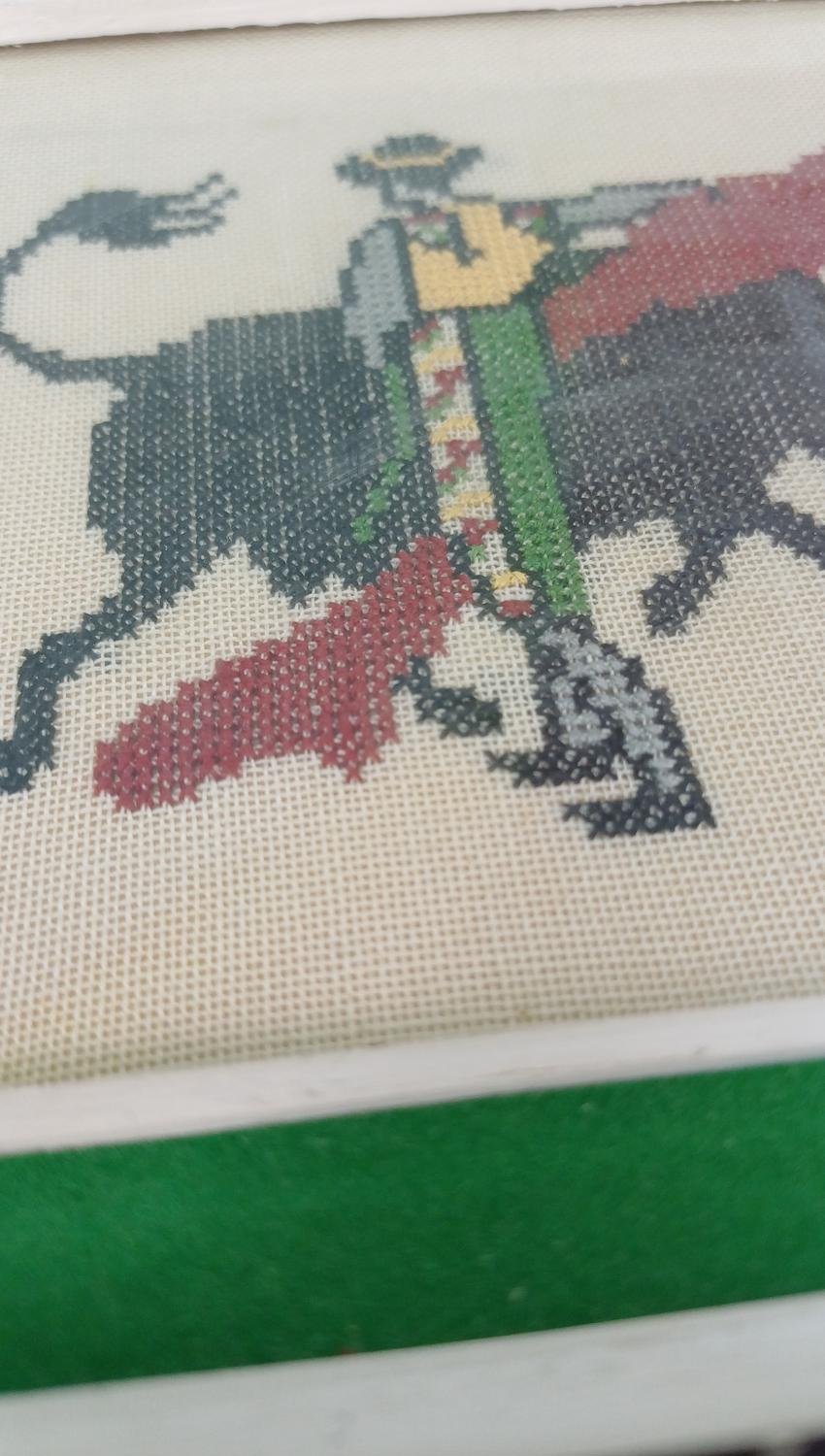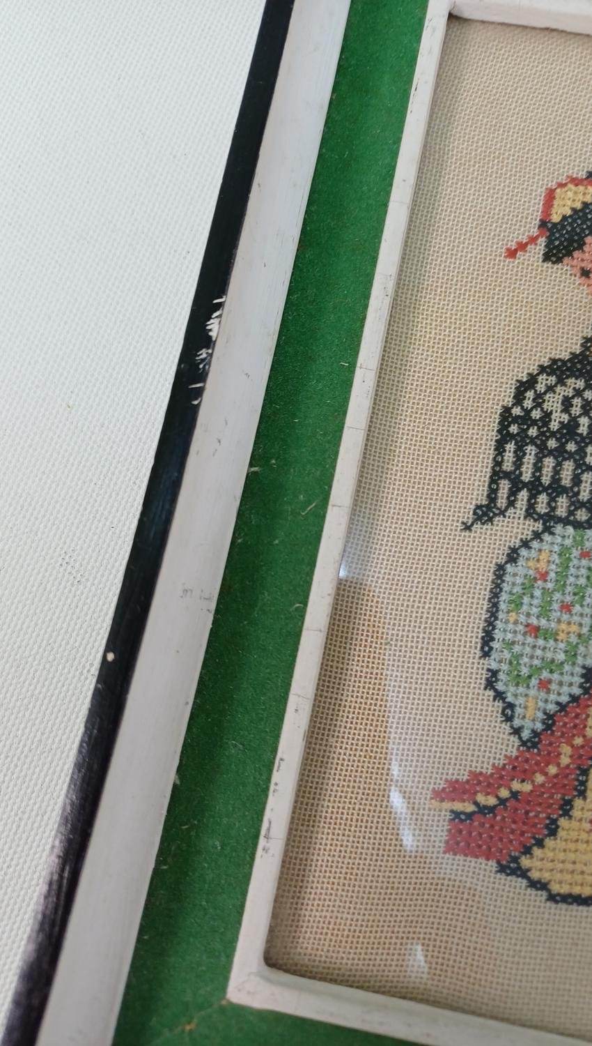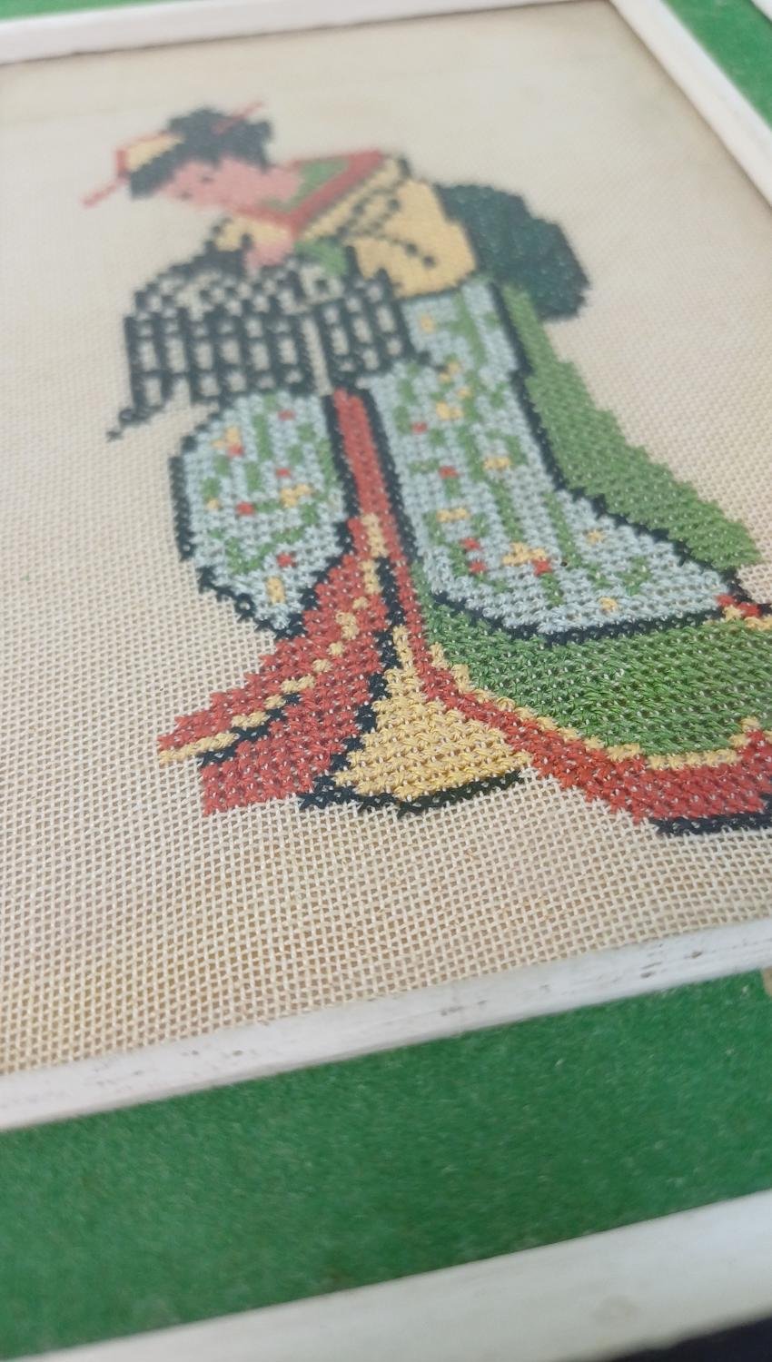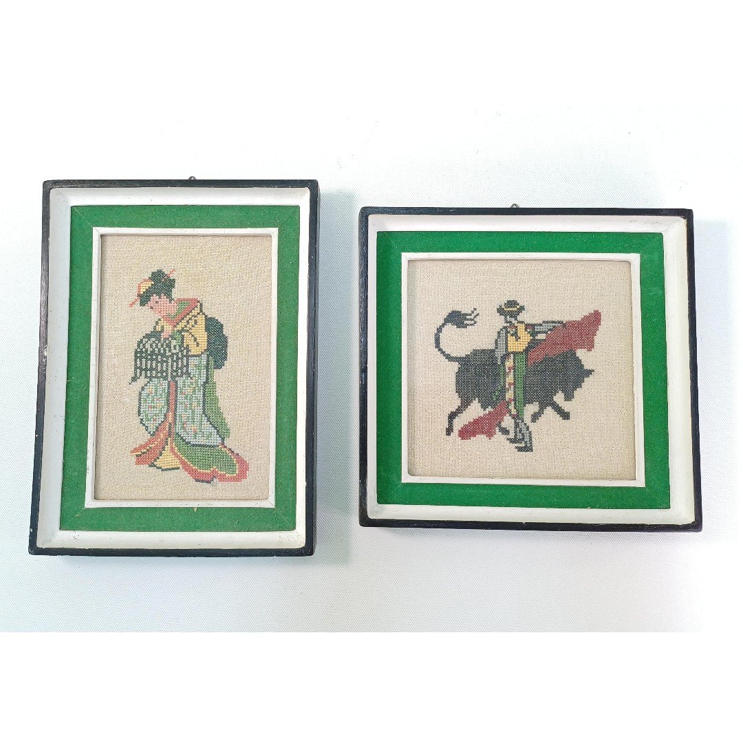 2 ξύλινες κορνίζες με vintage χειροποίητα κεντήματα 2 θεμάτων. Η μια κορνίζα απεικονίζει μια γκέισα με παραδοσιακή φορεσιά και οι διαστάσεις της είναι 20,5 x 15 cm. Η δεύτερη κορνίζα απεικονίζει μια σκηνή ταυρομαχίας και οι διαστάσεις της είναι 18 x 18 cm.