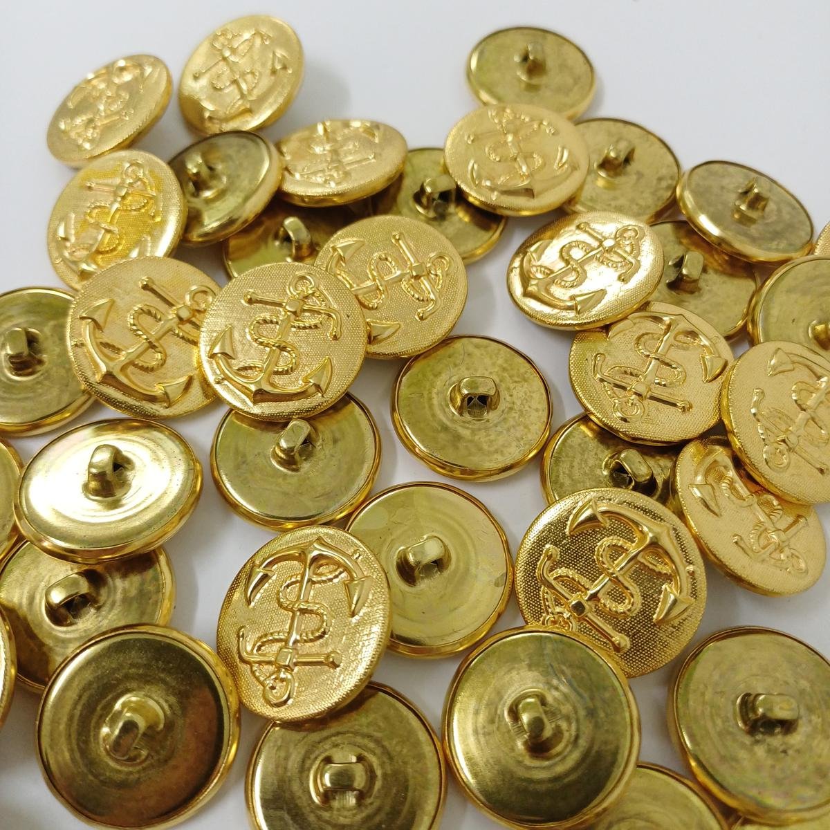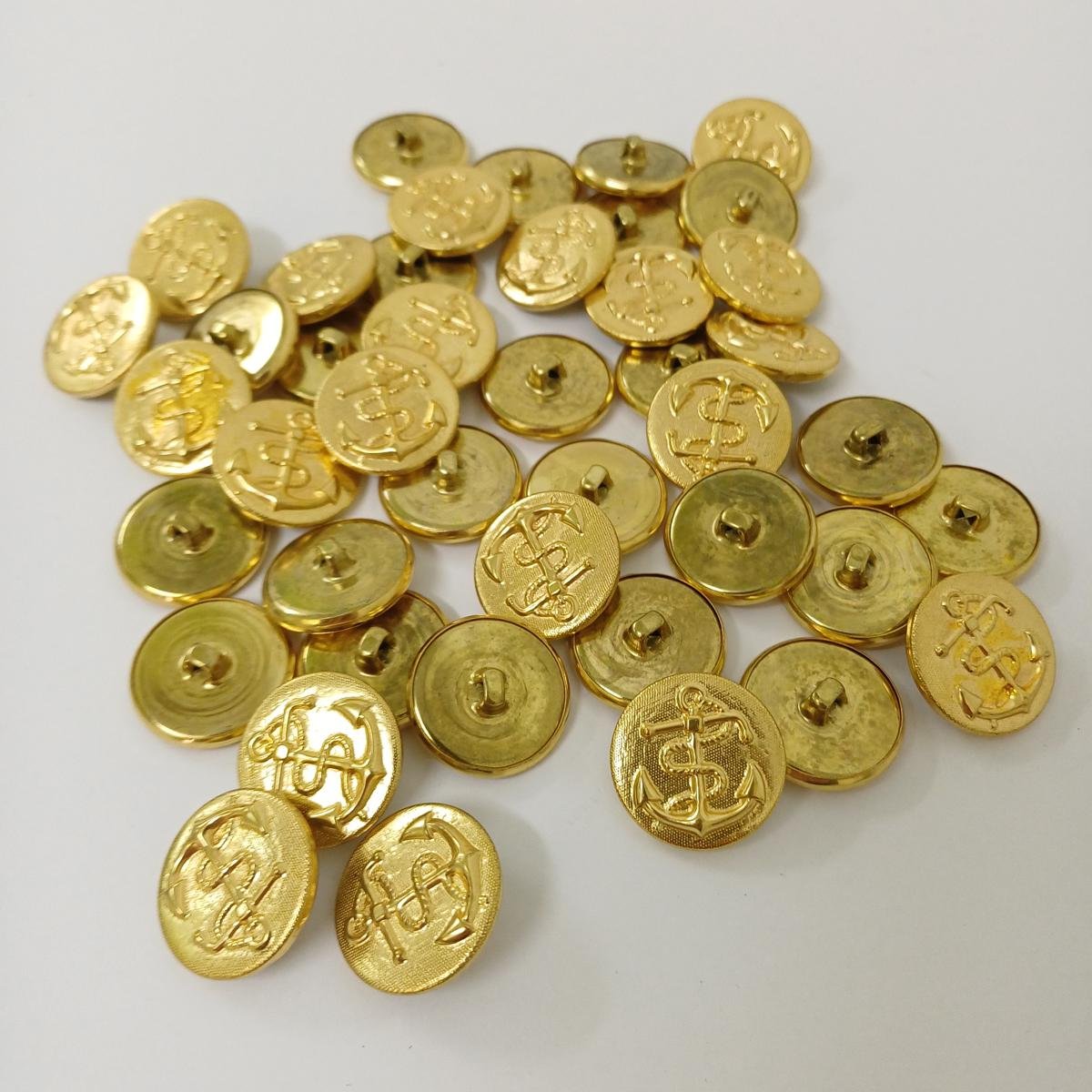 100 μεταλλικά κουμπιά ναυτικής ενδυμασίας σε χρυσό χρώμα, με σχέδιο άγκυρας. Η διάμετρός τους είναι 2,3 cm.