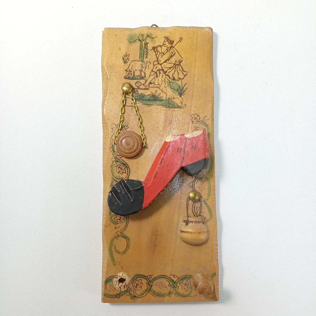Vintage κρεμάστρα τοίχου με βουκολική διακόσμηση. Στο πάνω μέρος απεικονίζεται ένας βοσκός και υπάρχουν τρισδιάστατα στοιχεία όπως ένα παγούρι, ένα τσαρούχι και μια καρδάρα.