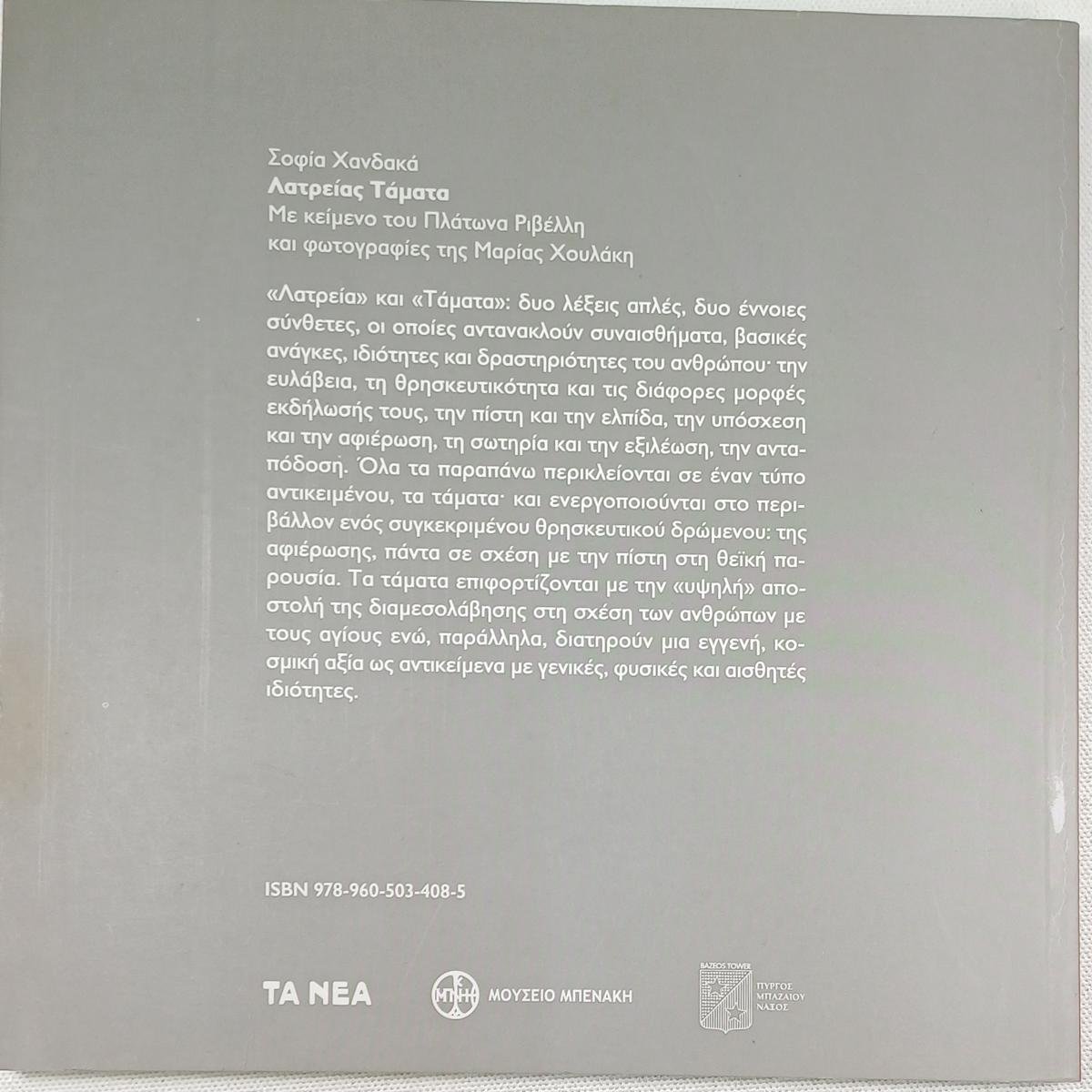 Το βιβλίο «Λατρείας Τάματα», σε επιμέλεια της Σοφίας Χανδακά, αποτελεί μια έκδοση του Μουσείου Μπενάκη και της εφημερίδας ΤΑ ΝΕΑ, η οποία εξετάζει αναλυτικά τη συλλογή ταμάτων του μουσείου, εστιάζοντας στον διττό τους ρόλο ως θρησκευτικά αντικείμενα και έργα του νεοελληνικού πολιτισμού. Η έκδοση, που κυκλοφόρησε με αφορμή ομώνυμη έκθεση στον Πύργο Βαζαίου στη Νάξο, περιλαμβάνει επίσης κείμενο του Πλάτωνα Ριβέλλη σχετικά με τη φωτογραφική απεικόνιση των αναθημάτων, με φωτογραφίες της Μαρίας Χουλάκη.