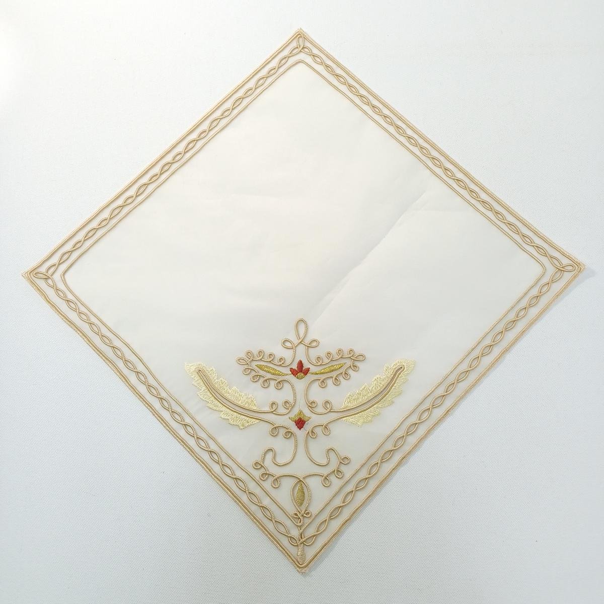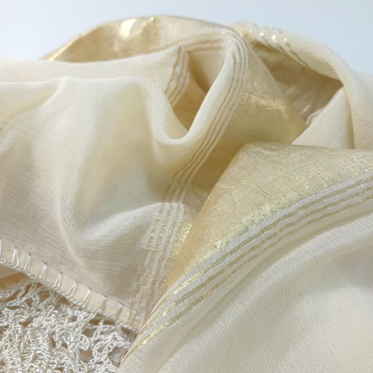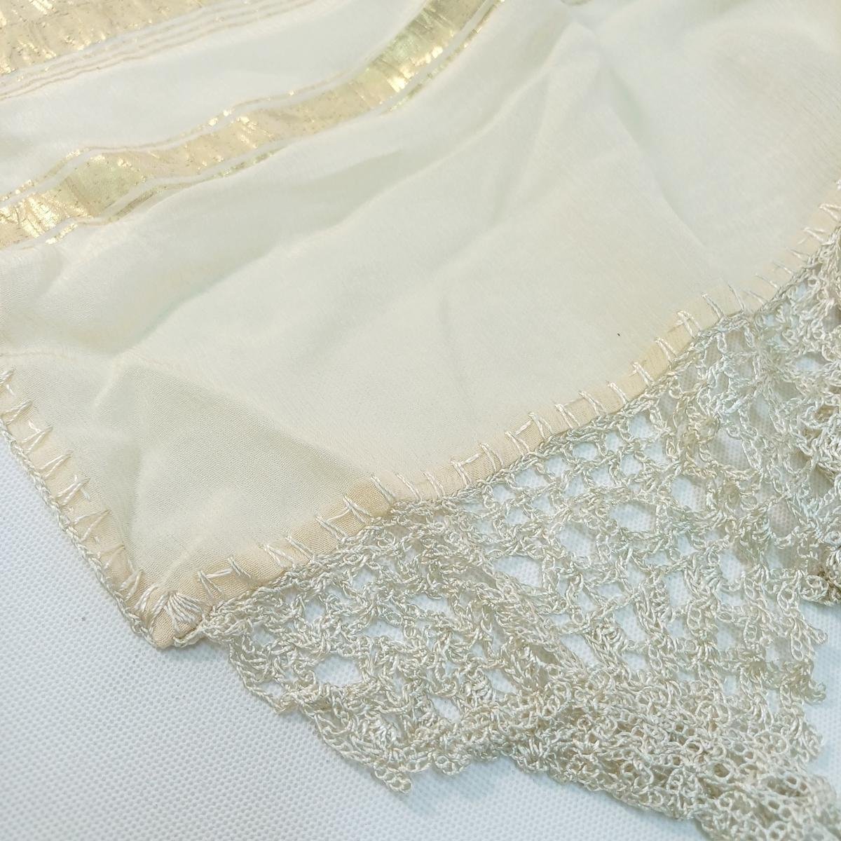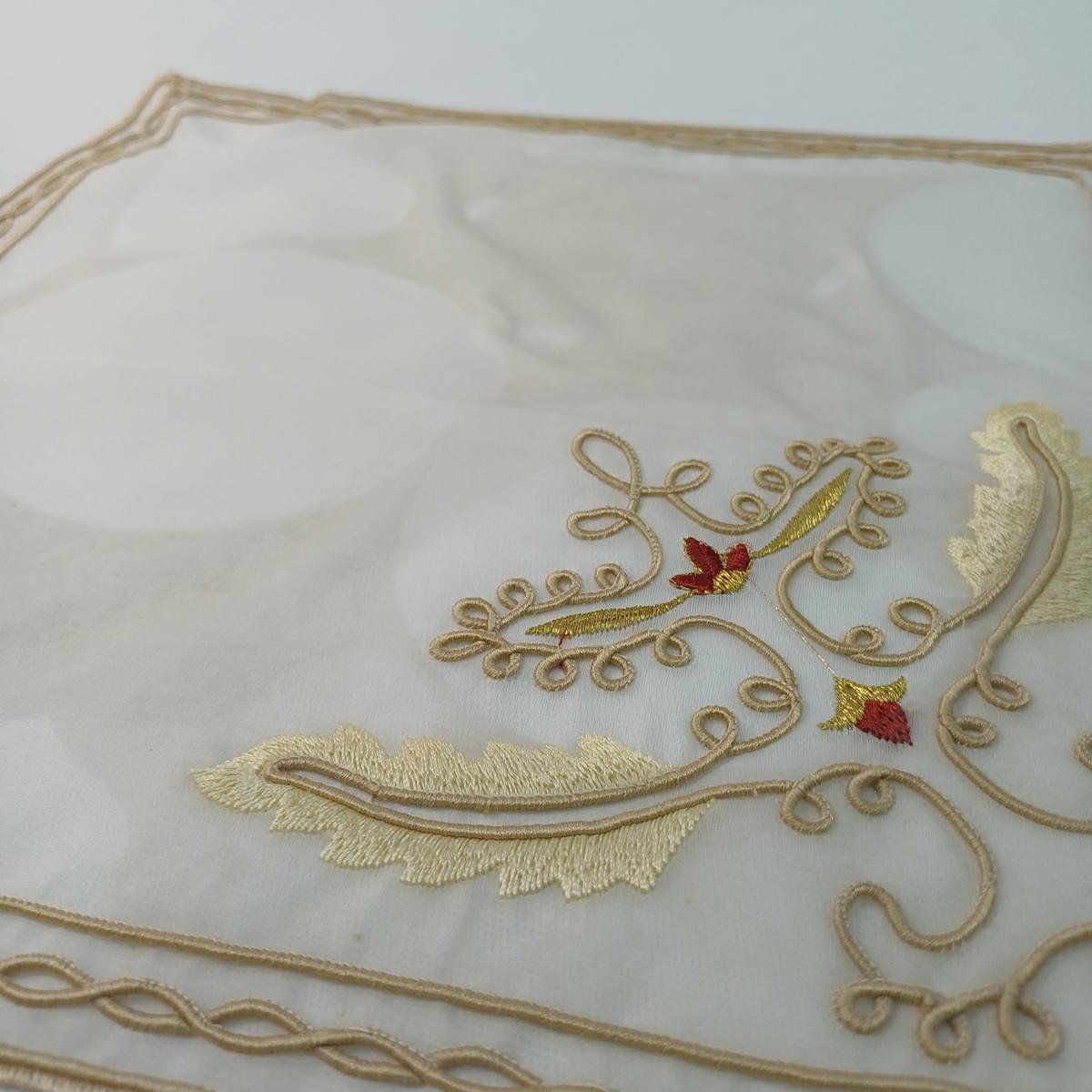 Σετ λευκών ειδών από οργάντζα για διακόσμηση τραπεζιού. Είναι σε εκρού και χρυσό χρώμα. Η τραβέρσα έχει διαστάσεις 0,55 * 1,53 m και έχει πλεκτά κρόσσια (αραιής πλέξης). Τα 16 διακοσμητικά πετσετάκια πιάτου έχουν διαστάσεις 31 * 31 cm.