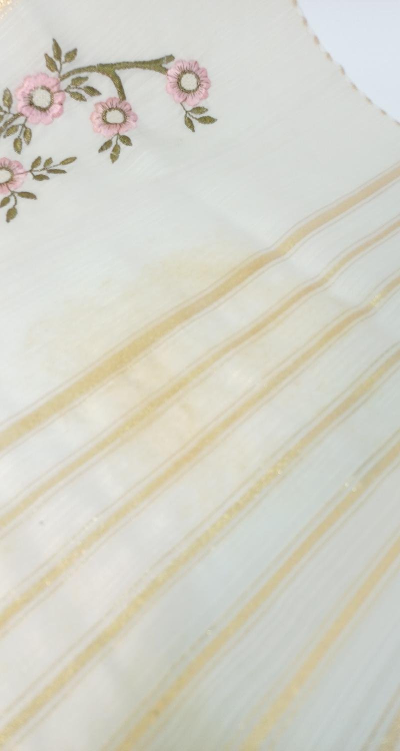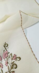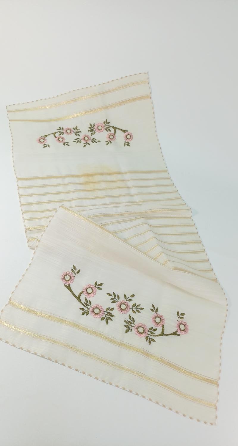 LOT 7 λευκών ειδών σε εκρού αποχρώσεις και σχέδια ροζ λουλουδιών. Αποτελείται από: 1) 1 τραβέρσα διαστάσεων 0,50 * 1,60 m, 2) 1 τραβέρσα διαστάσεων 0,46 * 1,00 m η οποία είναι σετ με 2 σεμέν διαστάσεων 39 * 23 cm, 3) 1 τραβέρσα διαστάσεων 44 * 96 cm η οποία είναι σετ με 2 σεμέν διαστάσεων 30 * 25 cm.