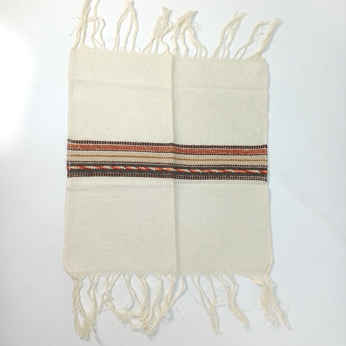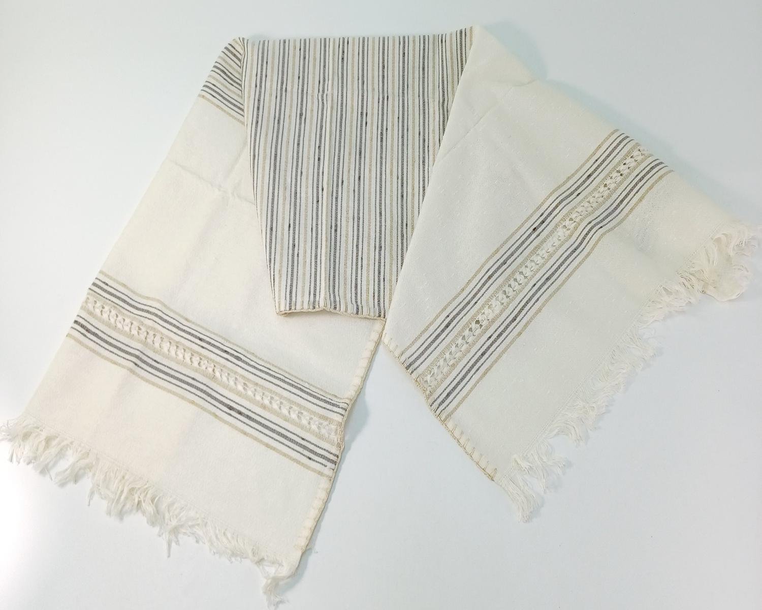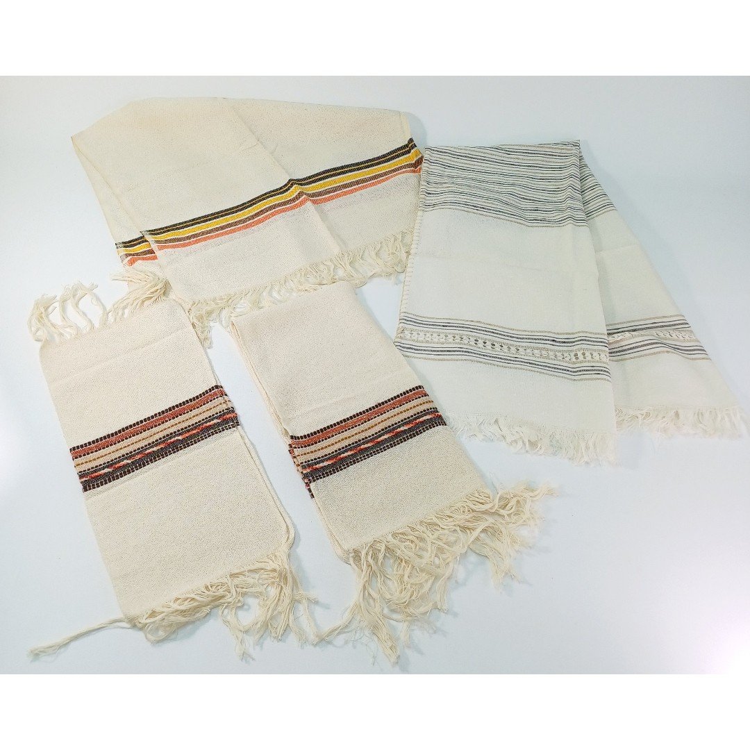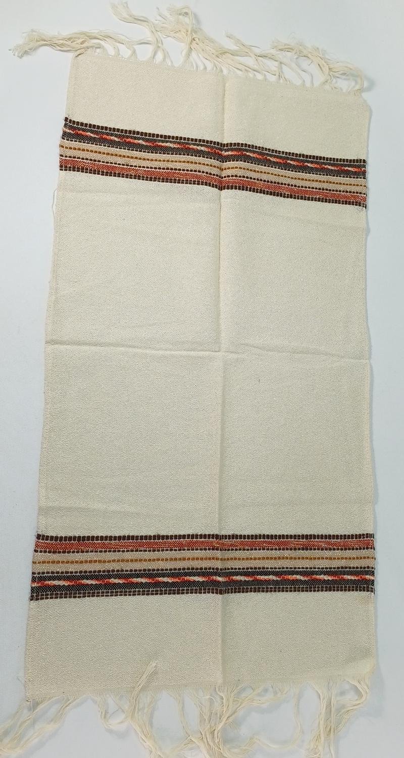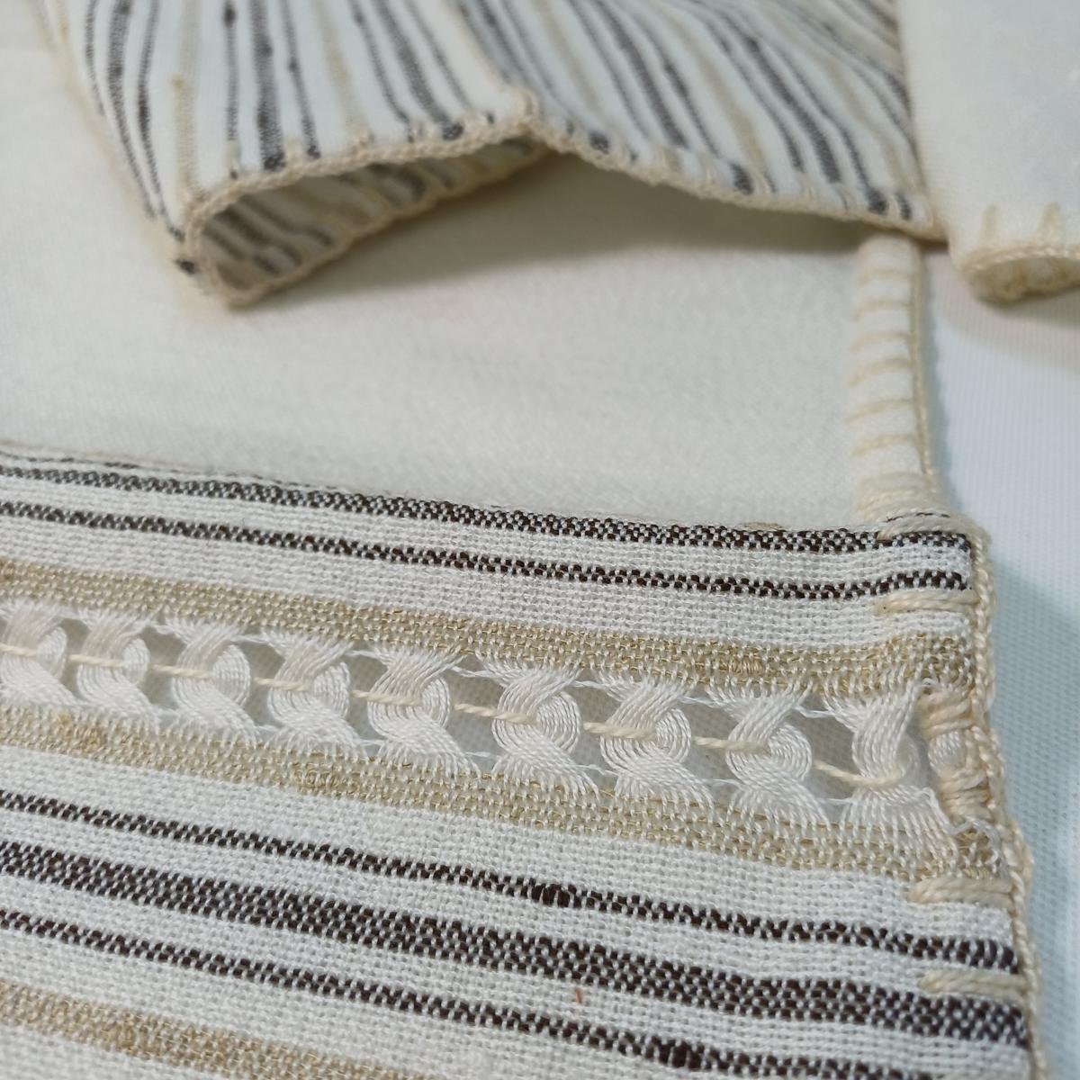 LOT 4 λευκών ειδών σε εκρού αποχρώσεις και διακοσμητικές ρίγες σε γήινα χρώματα. Το οποίο LOT αποτελείται από: 1) μία τραβέρσα διαστάσεων 50 x 94 cm, 2) μία τραβέρσα 73 x 37 cm, 3) μια πετσέτα 40 x 37 cm και 4) μία τραβέρσα 1,12 x 0,50 m. Όλα τα τεμάχια έχουν κρόσσια σε δυο πλευρές. Είναι μεταχειρισμένα σε πολύ καλή κατάσταση.