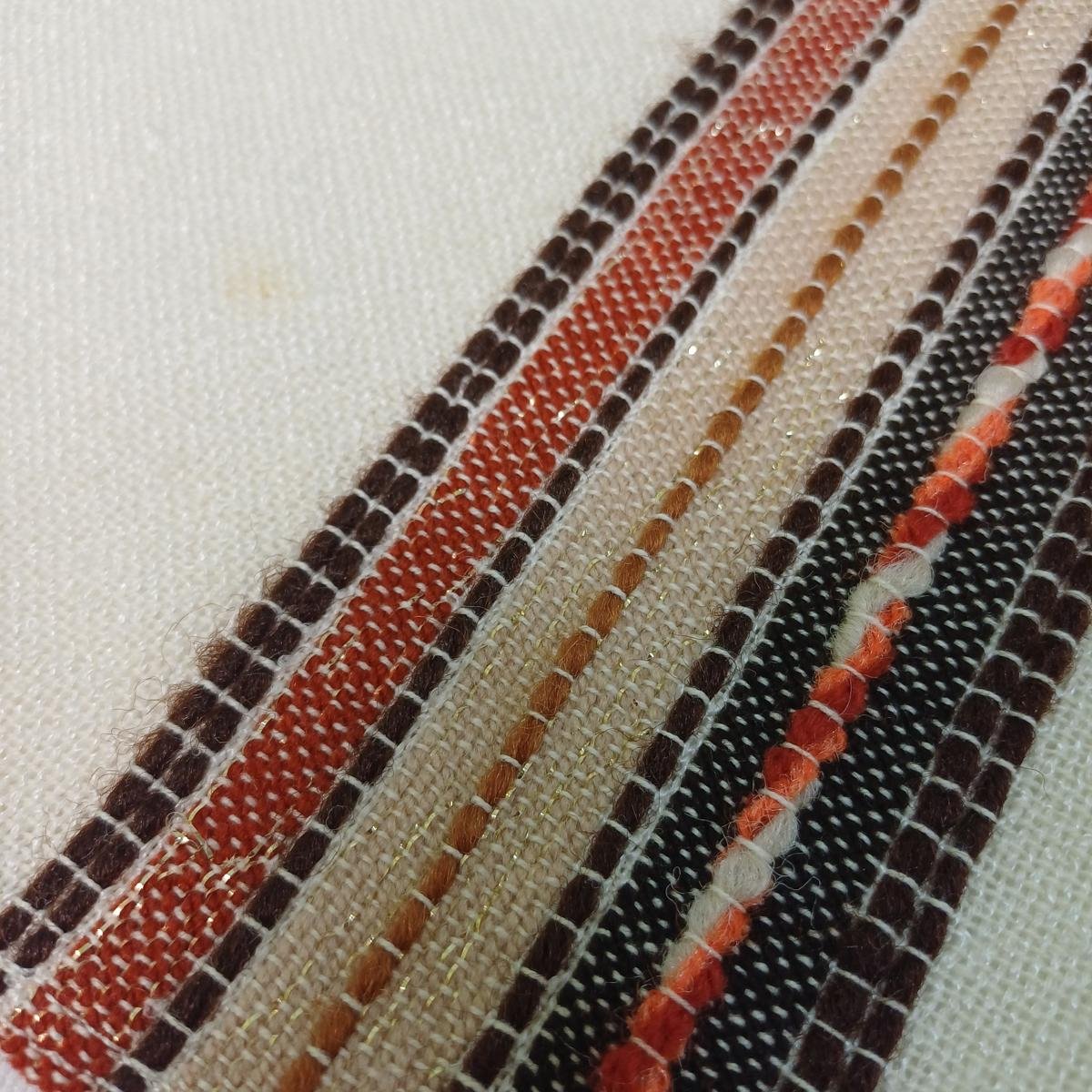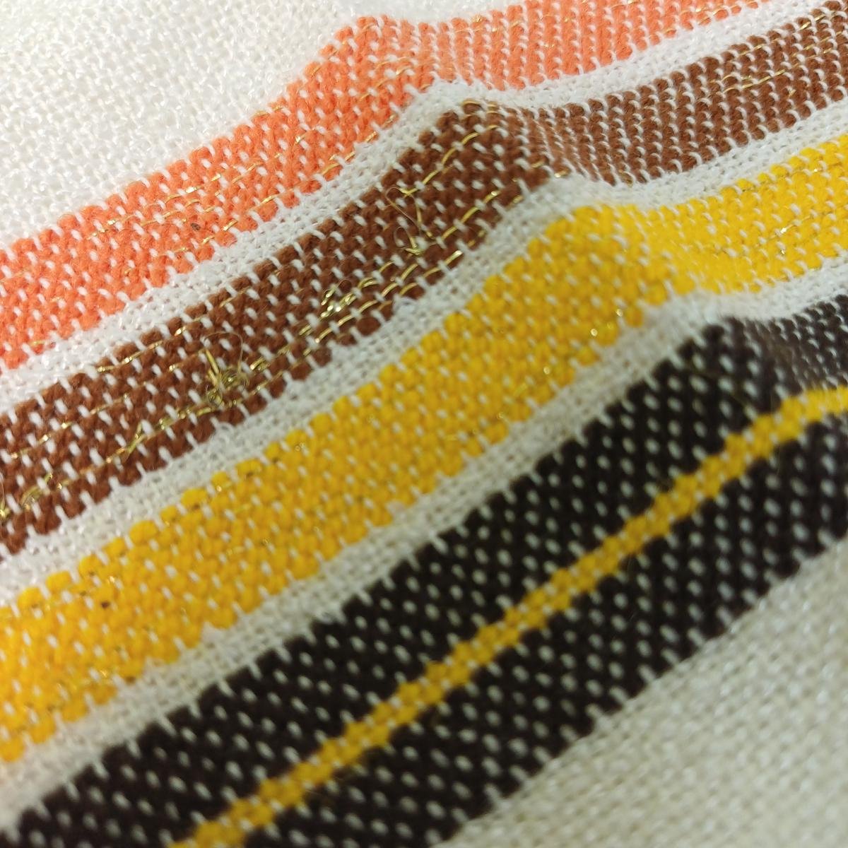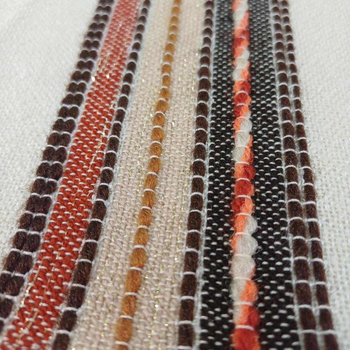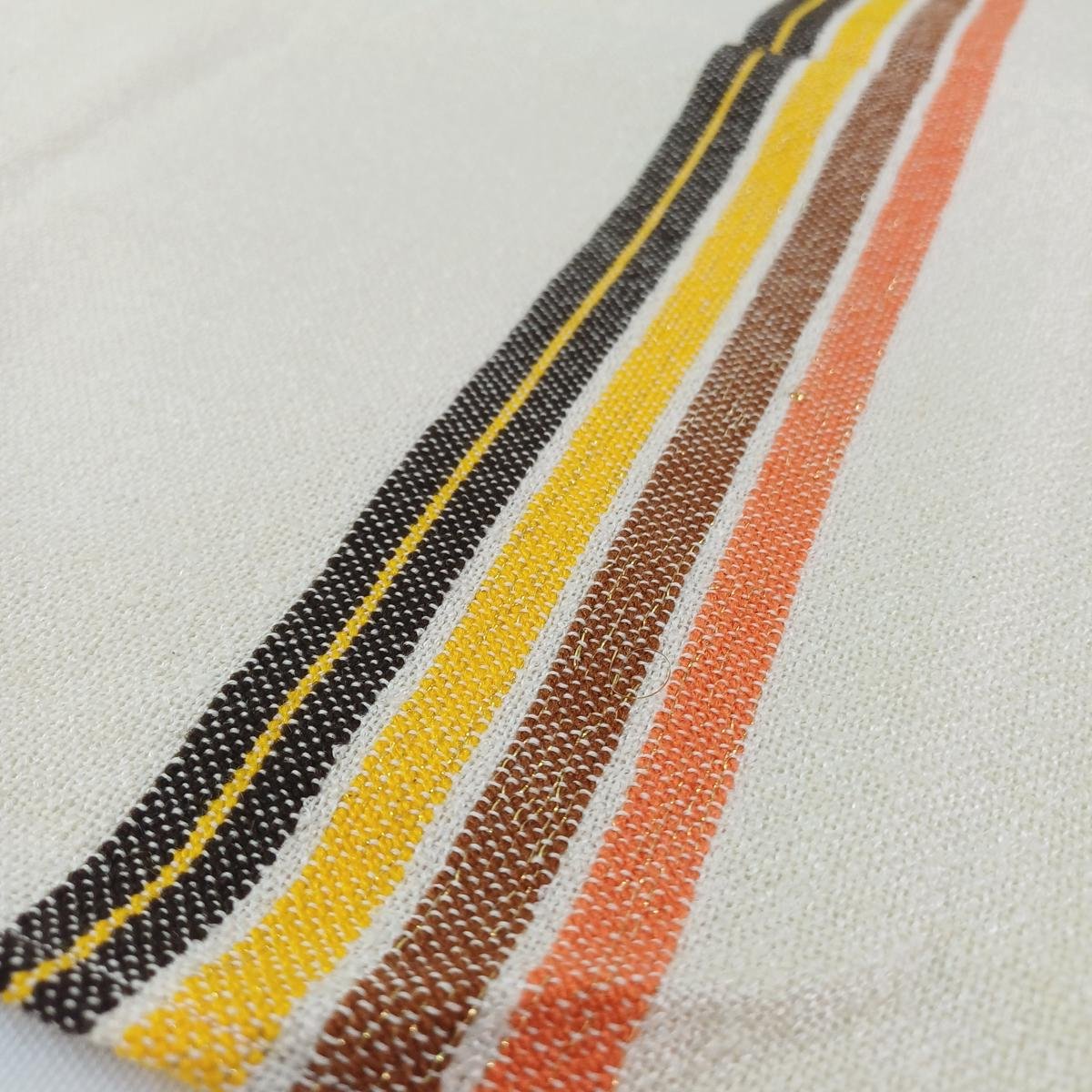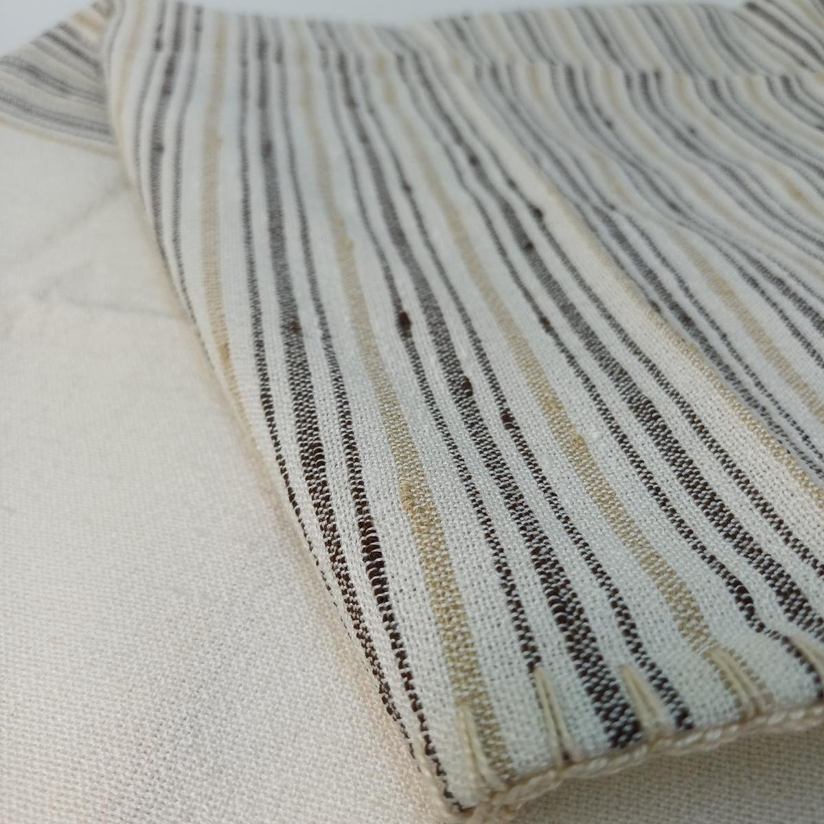 LOT 4 λευκών ειδών σε εκρού αποχρώσεις και διακοσμητικές ρίγες σε γήινα χρώματα. Το οποίο LOT αποτελείται από: 1) μία τραβέρσα διαστάσεων 50 x 94 cm, 2) μία τραβέρσα 73 x 37 cm, 3) μια πετσέτα 40 x 37 cm και 4) μία τραβέρσα 1,12 x 0,50 m. Όλα τα τεμάχια έχουν κρόσσια σε δυο πλευρές. Είναι μεταχειρισμένα σε πολύ καλή κατάσταση.