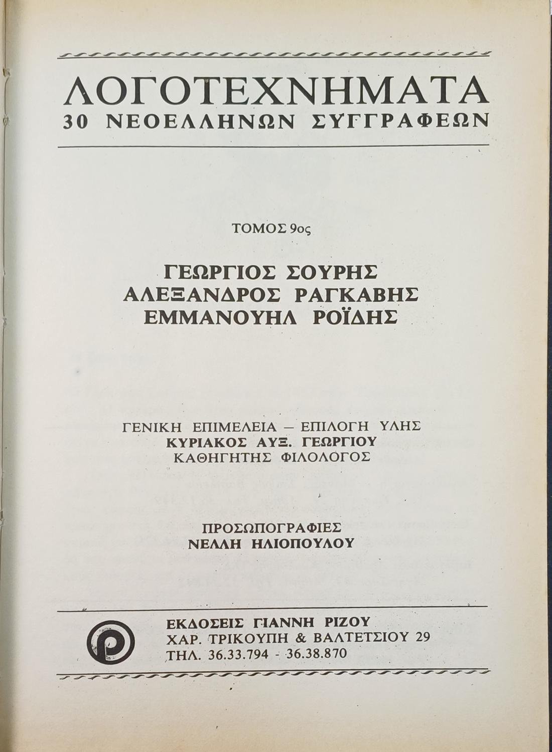 Ο ένατος τόμος του βιβλίου της σειράς «Λογοτεχνήματα 30 Νεοελλήνων Συγγραφέων», μια ανθολογία που συγκεντρώνει έργα τριών σημαντικών Ελλήνων κλασικών λογοτεχνών: του Γεώργιου Σουρή, Αλέξανδρου Ραγκαβή και του Εμμανουήλ Ροΐδη. Η έκδοση, με γενική επιμέλεια του Κυριάκου Αυξ. Γεωργίου, περιλαμβάνει λογοτεχνικά κείμενα από κάθε συγγραφέα, προσφέροντας μια αντιπροσωπευτική εικόνα της δουλειάς τους.