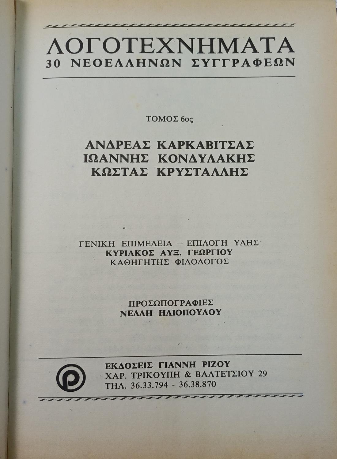 Ο έκτος τόμος του βιβλίου της σειράς «Λογοτεχνήματα 30 Νεοελλήνων Συγγραφέων», μια ανθολογία που συγκεντρώνει έργα τριών σημαντικών Ελλήνων κλασικών λογοτεχνών: του Ανδρέα Καρκαβίτσα, Ιωάννη Κονδυλάκη και του Κώστα Κρυστάλλη. Η έκδοση, με γενική επιμέλεια του Κυριάκου Αυξ. Γεωργίου, περιλαμβάνει λογοτεχνικά κείμενα από κάθε συγγραφέα, προσφέροντας μια αντιπροσωπευτική εικόνα της δουλειάς τους.