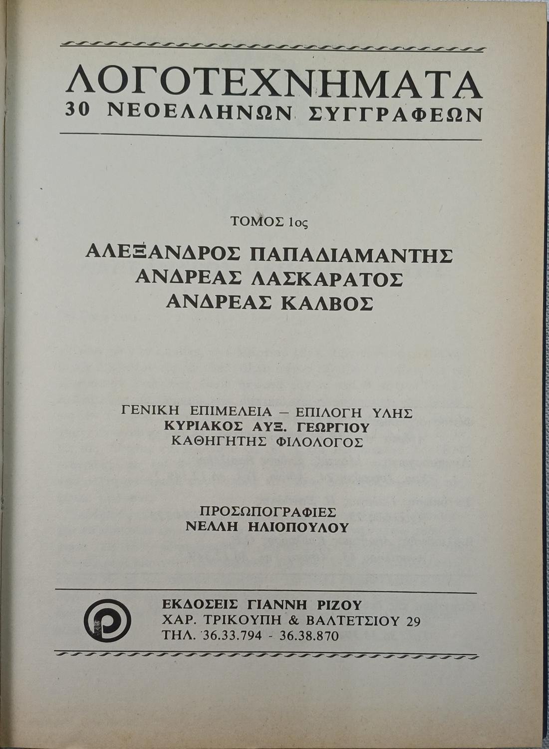 Ο πρώτος τόμος του βιβλίου της σειράς «Λογοτεχνήματα 30 Νεοελλήνων Συγγραφέων», μια ανθολογία που συγκεντρώνει έργα τριών σημαντικών Ελλήνων κλασικών λογοτεχνών: του Αλέξανδρου Παπαδιαμάντη, του Ανδρέα Λασκαράτου και του Ανδρέα Κάλβου. Η έκδοση, με γενική επιμέλεια του Κυριάκου Αυξ. Γεωργίου, περιλαμβάνει λογοτεχνικά κείμενα από κάθε συγγραφέα, προσφέροντας μια αντιπροσωπευτική εικόνα της δουλειάς τους.