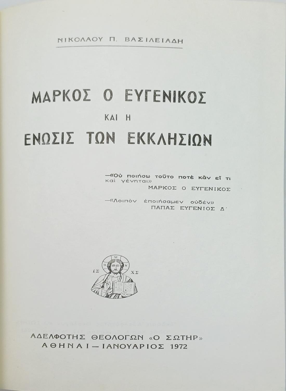 “Μάρκος ο Ευγενικός και η ένωσις των εκκλησιών” Νικόλαος Π. Βασιλειάδης (1972)