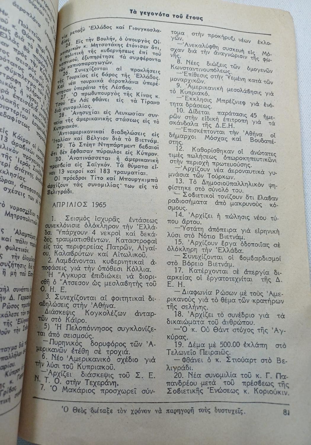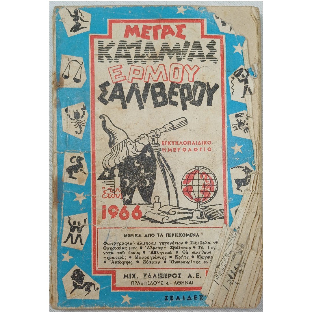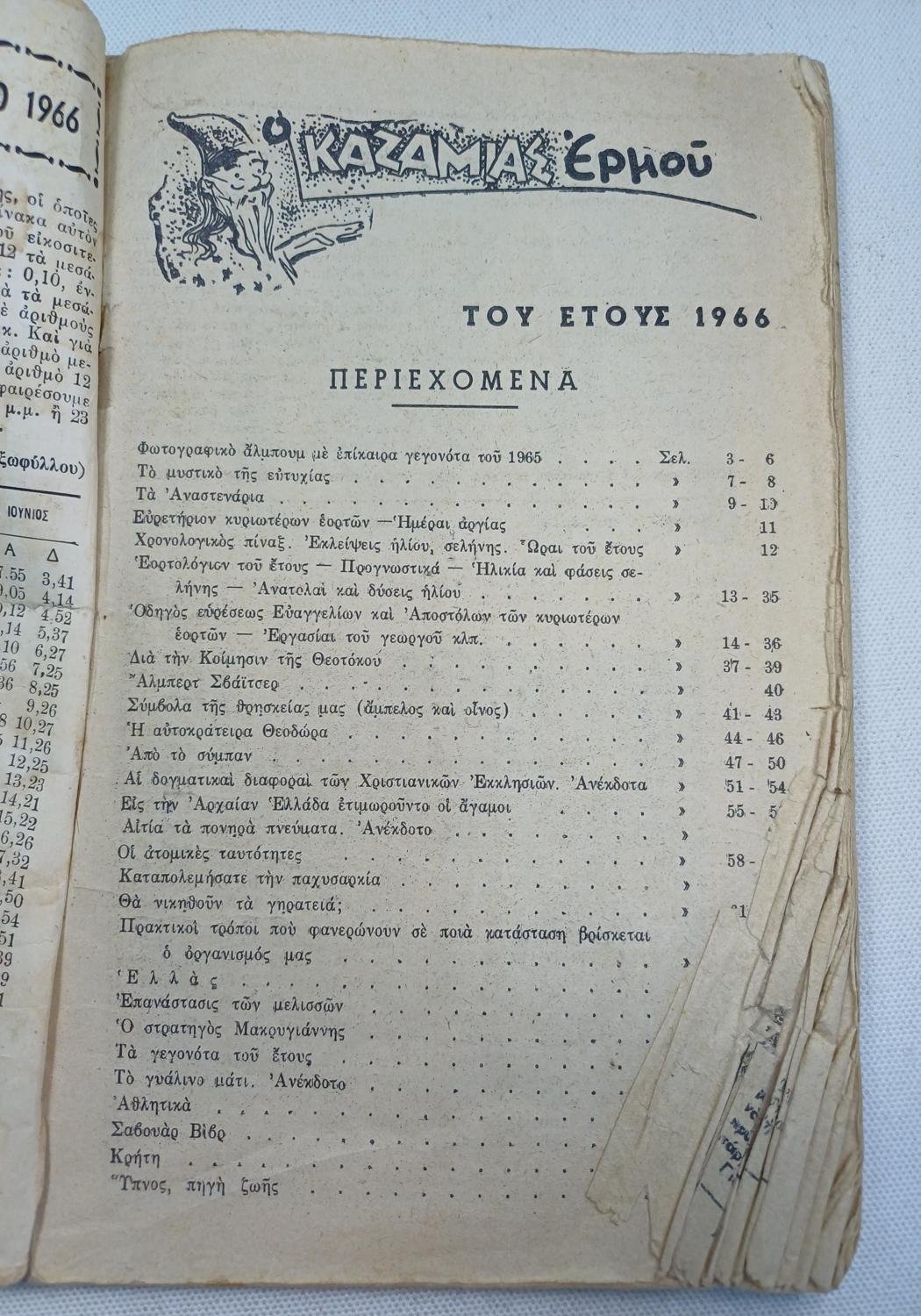 Το περιοδικό “Μέγας Καζαμίας” του 1966 είναι ένα δημοφιλές εγκυκλοπαιδικό ημερολόγιο και λαϊκό ανάγνωσμα, που περιλαμβάνει ποικίλη ύλη, συνδυάζοντας την ενημέρωση με τη διασκέδαση και τις παραδόσεις της εποχής. Στα περιεχόμενά του συγκαταλέγονται ένα φωτογραφικό άλμπουμ με τα σημαντικότερα γεγονότα της χρονιάς, κείμενα για σύμβολα της θρησκείας, αναφορές σε ιστορικές και πολιτιστικές προσωπικότητες όπως ο Άλμπερτ Σβάιτσερ και ο Μακρυγιάννης, πρακτικές συμβουλές για μαγειρική, υγεία, ονειροκρίτη, καθώς και αθλητικά θέματα, αναφορές στις Απόκριες και άρθρα για το σύμπαν και τη γεωγραφία, όπως την Κρήτη.