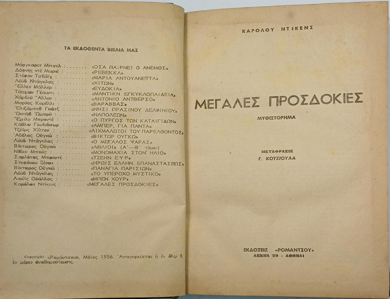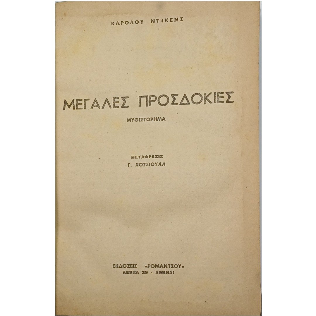Το δυσεύρετο βιβλίο “Μεγάλες Προσδοκίες” του Καρόλου Ντίκενς αφηγείται την ιστορία του Φίλιπ Πίριπ, ενός ορφανού αγοριού γνωστού ως Πιπ, ο οποίος από ταπεινός μαθητευόμενος σιδηρουργός στην αγγλική επαρχία ενηλικιώνεται με «μεγάλες προσδοκίες» όταν ένας μυστηριώδης ευεργέτης τού προσφέρει πλούτο και την ευκαιρία να γίνει κύριος (gentleman) στο Λονδίνο. Μέσα από τις περιπέτειες του Πιπ και τη συναναστροφή του με αξέχαστους χαρακτήρες, όπως η εκκεντρική δεσποινίς Χάβισαμ και η ψυχρή Εστέλα, το μυθιστόρημα εξερευνά θέματα κοινωνικής τάξης, φιλοδοξίας, πλούτου και ηθικής ανάπτυξης, αναδεικνύοντας τις συχνά απατηλές πλευρές των ανθρώπινων προσδοκιών και της κοινωνικής ανόδου στη βικτοριανή Αγγλία.