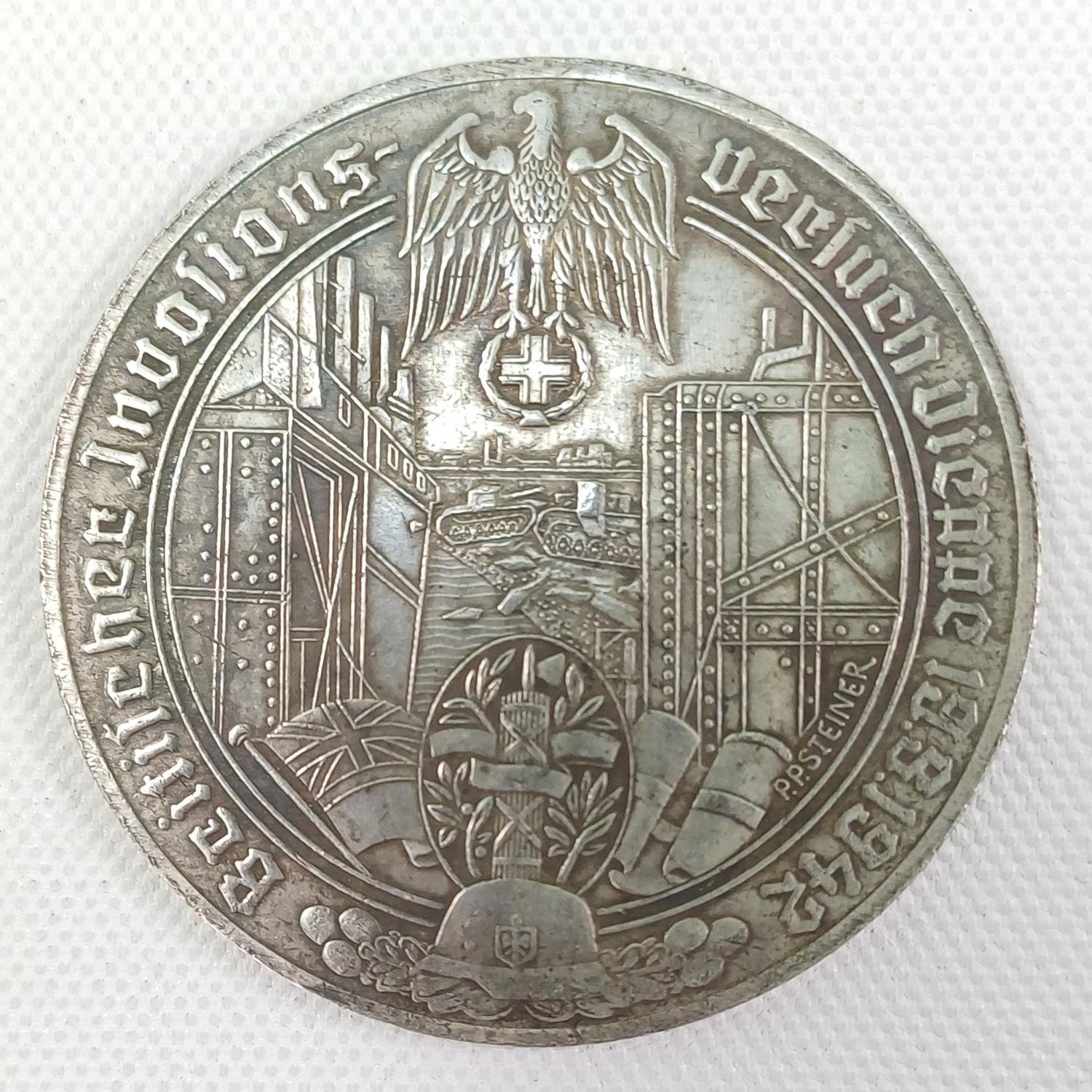 Αντίγραφο μεταλλίου που στην μια όψη απεικονίζει τη γερμανική προσπάθεια να αποκρούσει μια συμμαχική εισβολή στη Διέππη της Γαλλίας κατά τη διάρκεια του Β’ Παγκοσμίου Πολέμου. Ονομάζεται ‘Medaille auf den Britischen Invasionsversuch dei Dieppe’ (Μετάλλιο για τη Βρετανική Προσπάθεια Εισβολής στη Διέππη). Φέρει την ημερομηνία της επιχείρησης, 19-8-1942. Επίσης, απεικονίζεται ένας αετός να κρατά μια σβάστικα καθώς και πολεμικά πλοία, άρματα μάχης και όπλα. Η επιχείρηση αυτή, γνωστή και ως ‘Επιχείρηση Jubilee’ ήταν μια συμμαχική απόπειρα να καταληφθεί το λιμάνι της Διέππης. Η επιχείρηση απέτυχε με μεγάλες απώλειες για τους Συμμάχους.