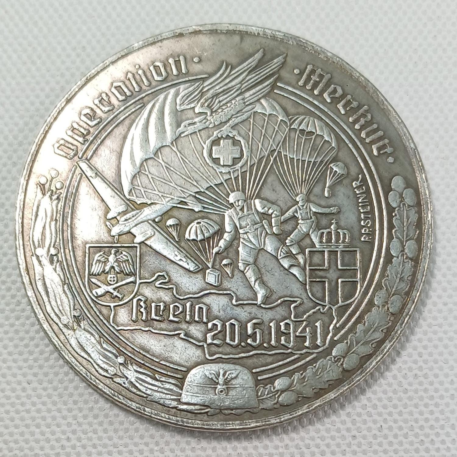 Αντίγραφο μεταλλίου για την Επιχείρηση Ερμής (Unternehmen Merkur), τη γερμανική αεροπορική εισβολή στην Κρήτη κατά τον Β’ Παγκόσμιο Πόλεμο. Η επιχείρηση ξεκίνησε στις 20 Μαΐου 1941, όπως αναγράφεται στο μετάλλιο. Στην μια όψη απεικονίζει Γερμανούς αλεξιπτωτιστές να πέφτουν με αλεξίπτωτο, ένα αεροσκάφος και το οικόσημο του Ρεθύμνου (Reeln), καθώς και το σύμβολο του Ερυθρού Σταυρού. Παρά την επιτυχία των Γερμανών στην κατάληψη της Κρήτης, οι απώλειες των αλεξιπτωτιστών ήταν τόσο μεγάλες που ο Χίτλερ διέταξε να μην πραγματοποιηθεί άλλη μεγάλη αεροπορική επιχείρηση.