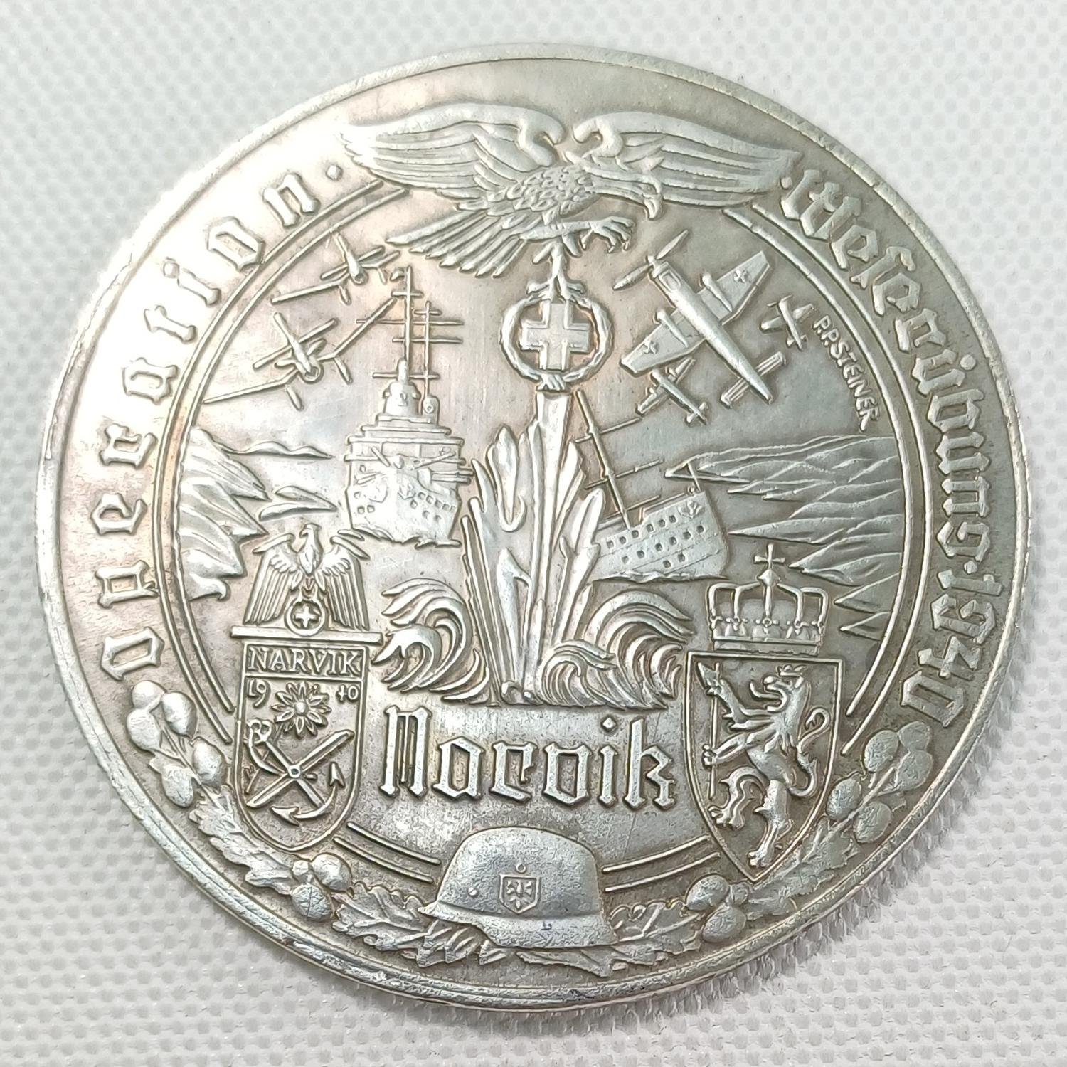 Αντίγραφο μεταλλίου που τιμά την συμμετοχή στη Μάχη του Νάρβικ, στη Νορβηγία, μεταξύ 9 Απριλίου και 8 Ιουνίου 1940, και την Επιχείρηση Weserübung στον Β΄ Παγκόσμιο Πόλεμο. Η Επιχείρηση Weserübung ήταν η γερμανική εισβολή στη Δανία και τη Νορβηγία. Στην μια όψη απεικονίζεται αεροσκάφη, πλοία, ο αετός σύμβολο της Ναζιστικής Γερμανίας καθώς και δυο εθνόσημα (της Νορβηγίας και της πόλης του Νάρβικ). Η Μάχη του Νάρβικ ήταν μια σημαντική στρατιωτική επιχείρηση μεταξύ των γερμανικών δυνάμεων και των συμμαχικών δυνάμεων με σκοπό τον έλεγχο του λιμανιού.