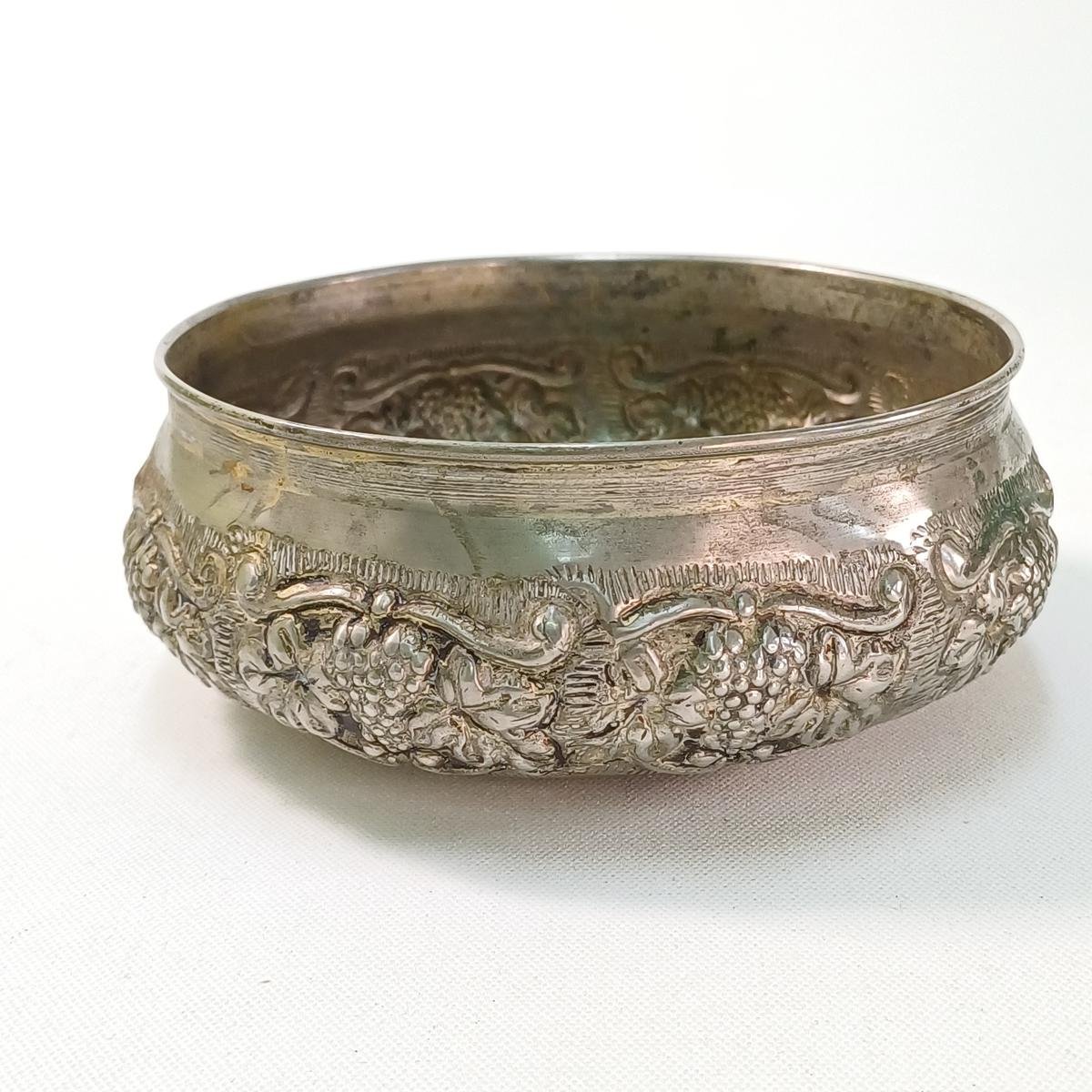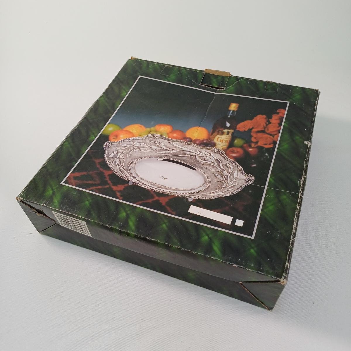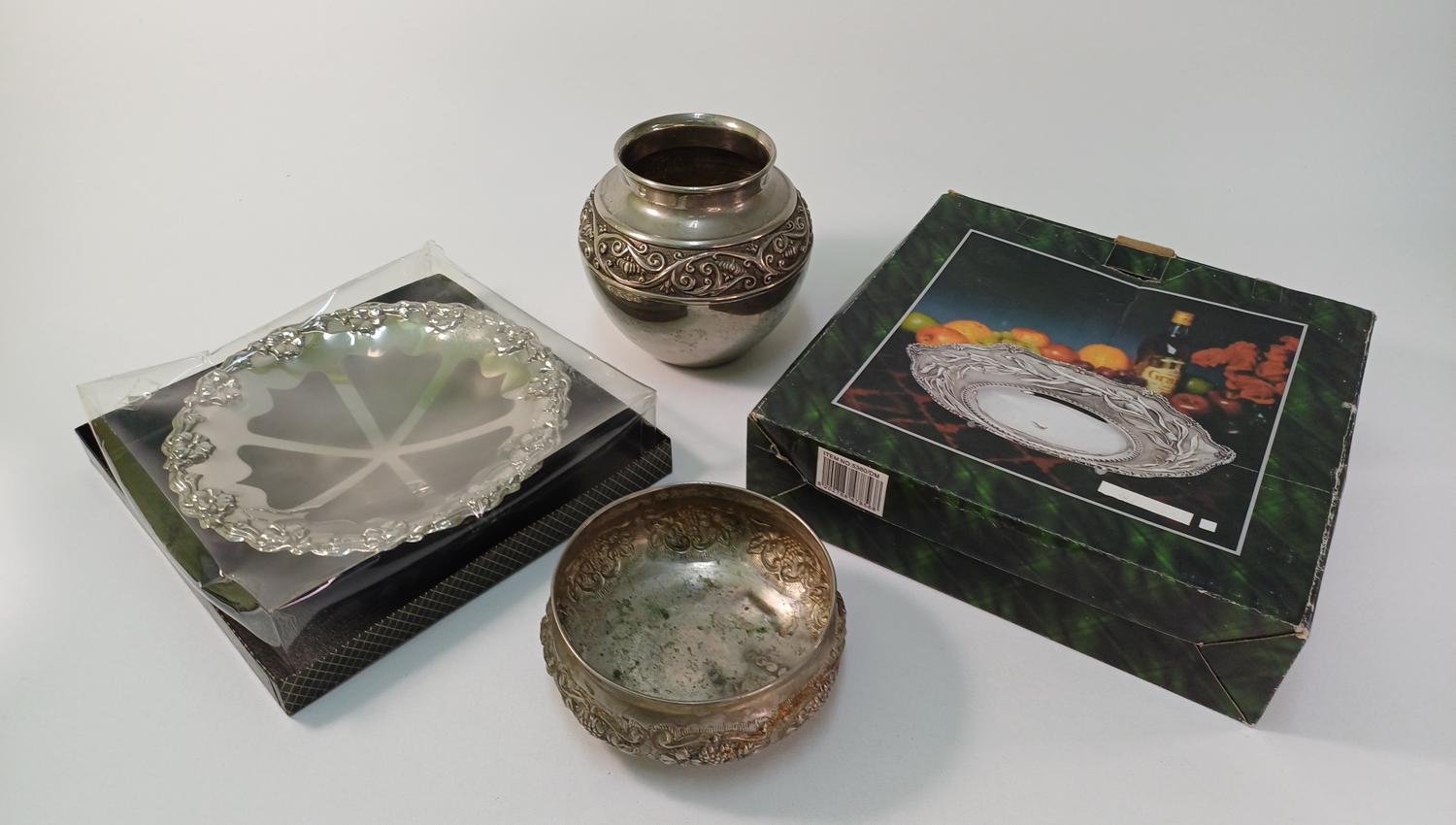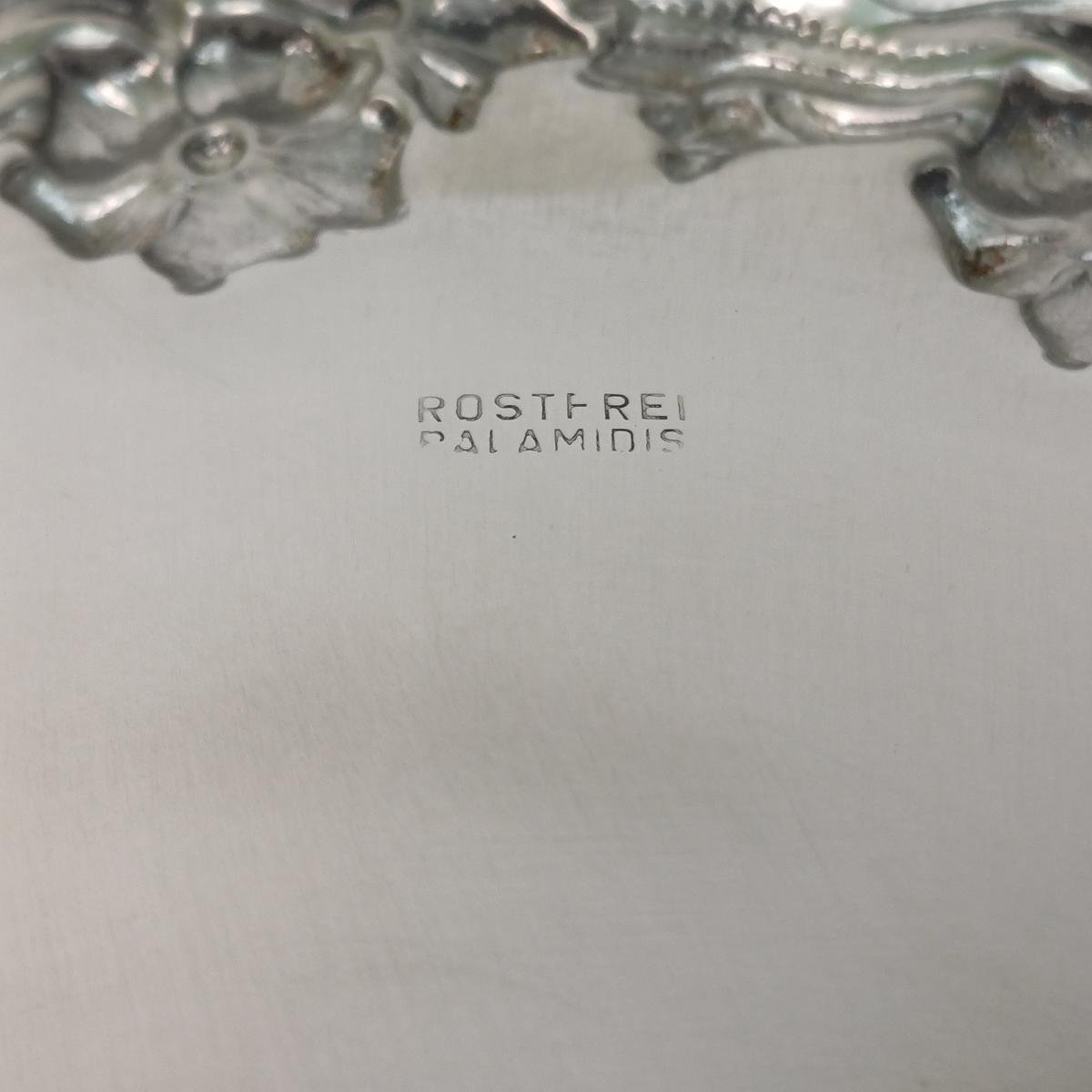 LOT 4 vintage διακοσμητικών αντικειμένων σαλονιού. Το LOT αποτελείται από: 1) 1 βάζο από αλπακά με περίτεχνη μπορντούρα. Έχει ύψος 14 cm και διάμετρο 14 cm. Φέρει φθορά στην επιφάνεια του μετάλλου (όπως επισημαίνεται στη φωτογραφία), 2) 1 μπολ από αλπακά με διακόσμηση σταφυλιών περιμετρικά. Έχει ύψος 6 cm και διάμετρο 14 cm. Φέρει φθορά στο μέταλλο λόγω παλαιότητας. 3) 1 διακοσμητικό πιάτο από ανοξείδωτο ατσάλι με την επιγραφή ROSTFREI (γερμανικός όρος που σημαίνει “χωρίς σκουριά” και υποδηλώνει ότι είναι ανοξείδωτο ατσάλι) της εταιρείας PALAMIDIS. Είναι αχρησιμοποίητο, στο κουτί του και έχει διάμετρο 22,5 cm. 4) 1 διακοσμητικό πιάτο από αλπακά με περίτεχνο γείσο. Είναι αχρησιμοποίητο, στο κουτί του και έχει διάμετρο 27,5 cm και ύψος 6 cm.