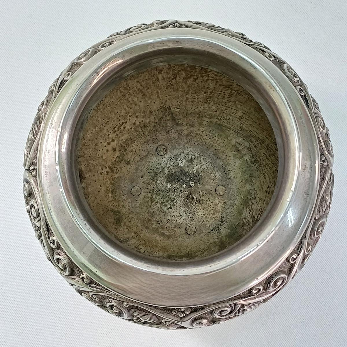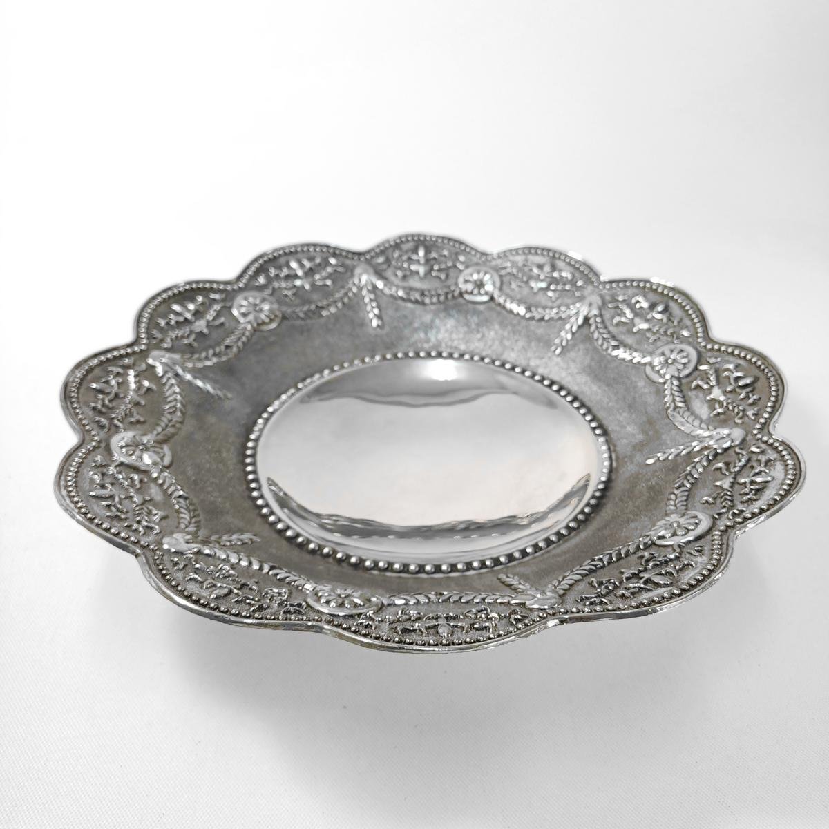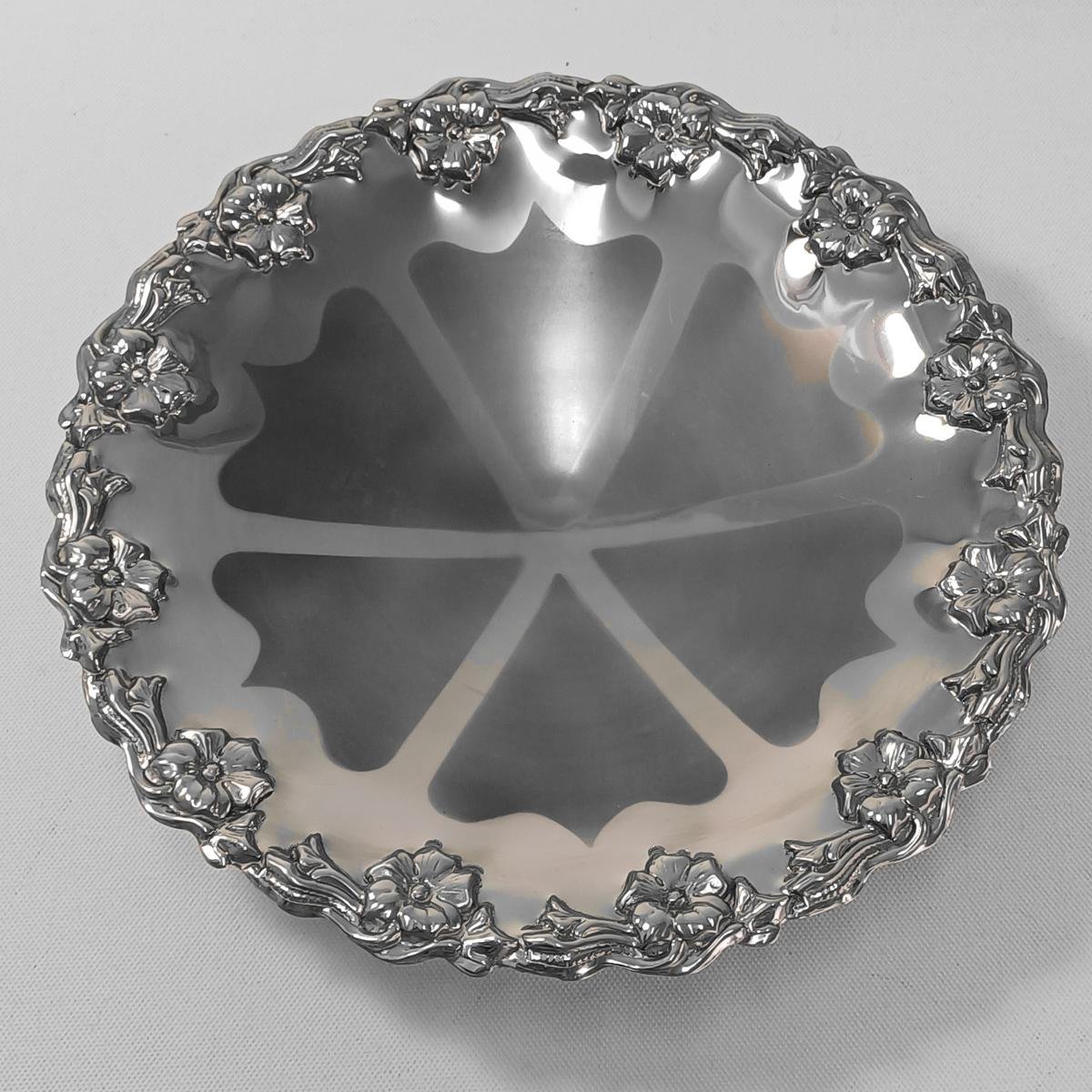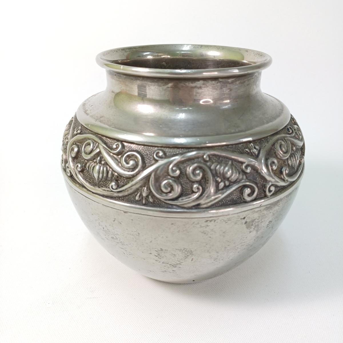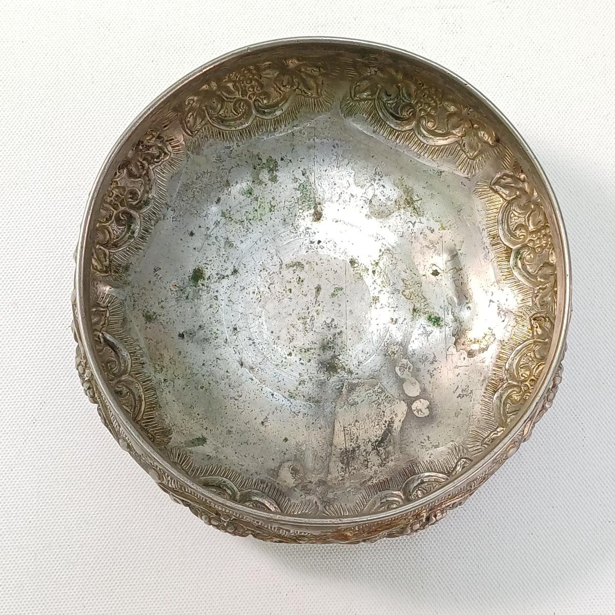 LOT 4 vintage διακοσμητικών αντικειμένων σαλονιού. Το LOT αποτελείται από: 1) 1 βάζο από αλπακά με περίτεχνη μπορντούρα. Έχει ύψος 14 cm και διάμετρο 14 cm. Φέρει φθορά στην επιφάνεια του μετάλλου (όπως επισημαίνεται στη φωτογραφία), 2) 1 μπολ από αλπακά με διακόσμηση σταφυλιών περιμετρικά. Έχει ύψος 6 cm και διάμετρο 14 cm. Φέρει φθορά στο μέταλλο λόγω παλαιότητας. 3) 1 διακοσμητικό πιάτο από ανοξείδωτο ατσάλι με την επιγραφή ROSTFREI (γερμανικός όρος που σημαίνει “χωρίς σκουριά” και υποδηλώνει ότι είναι ανοξείδωτο ατσάλι) της εταιρείας PALAMIDIS. Είναι αχρησιμοποίητο, στο κουτί του και έχει διάμετρο 22,5 cm. 4) 1 διακοσμητικό πιάτο από αλπακά με περίτεχνο γείσο. Είναι αχρησιμοποίητο, στο κουτί του και έχει διάμετρο 27,5 cm και ύψος 6 cm.