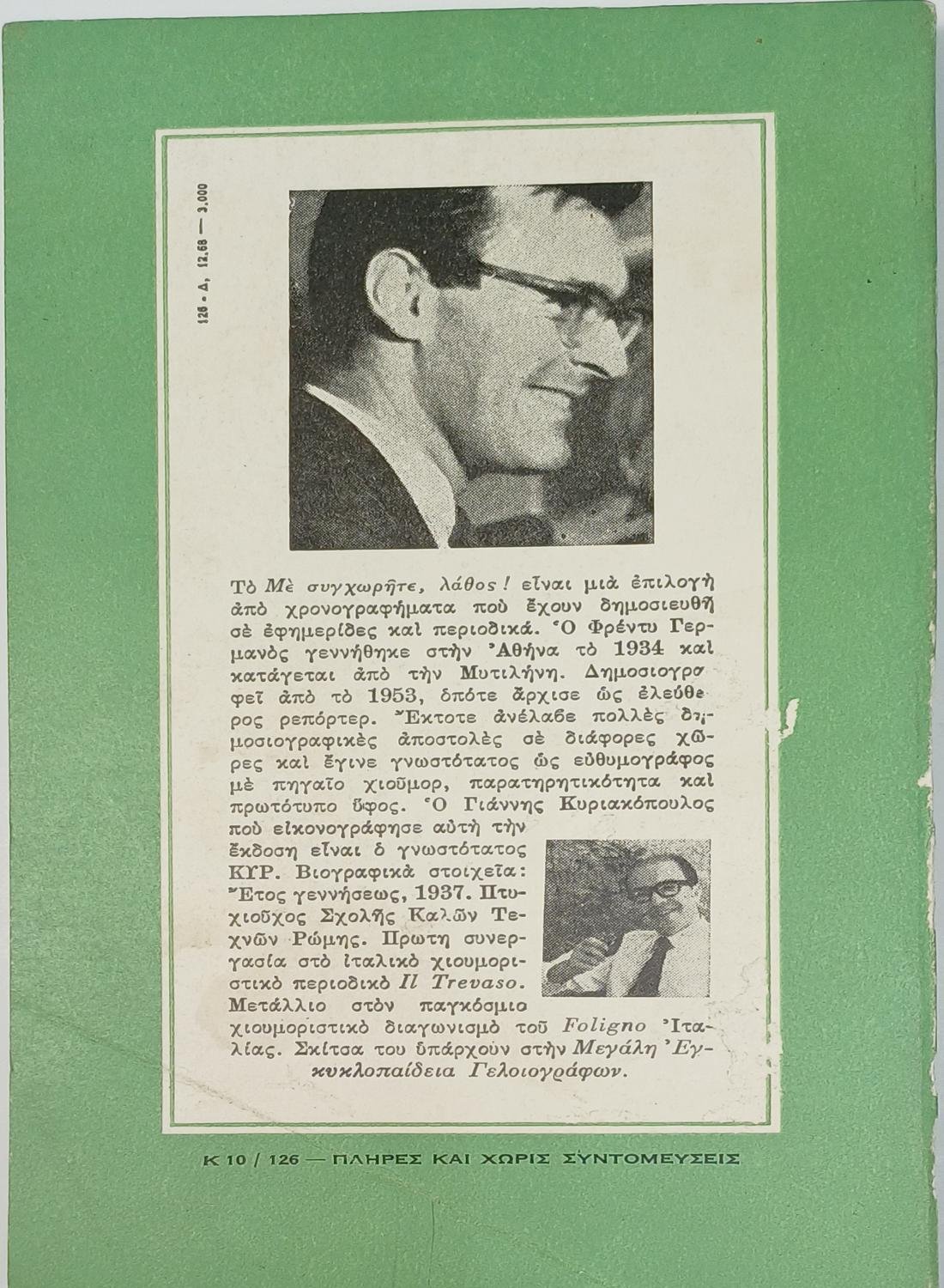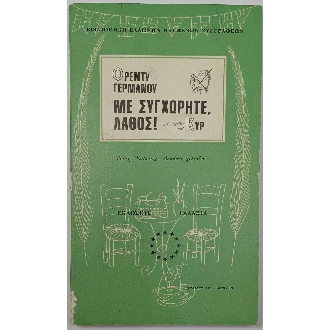 Το βιβλίο “Με συγχωρήτε, λάθος!” του Φρέντυ Γερμανού είναι μια συλλογή από ευθυμογραφήματα (χρονογραφήματα) που δημοσιεύτηκαν αρχικά στον Τύπο, προσφέροντας μια χιουμοριστική και συχνά σατιρική ματιά στην ελληνική πραγματικότητα της εποχής, με την εικονογράφηση του Κυρ. Μέσα από μικρές ιστορίες και παρατηρήσεις, ο συγγραφέας σχολιάζει με το χαρακτηριστικό του ύφος διάφορα κοινωνικά θέματα, καταστάσεις και συμπεριφορές, ενώ το 1964 αποτέλεσε το πρώτο του εκδοτικό έργο που γνώρισε μεγάλη επιτυχία.