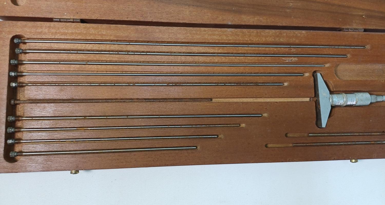 Vintage ξύλινη θήκη η οποία περιλαμβάνει ένα σετ μικρομέτρων βάθους έως 15″ (Depth Micrometer) της εταιρείας “Scherr-Tumico”