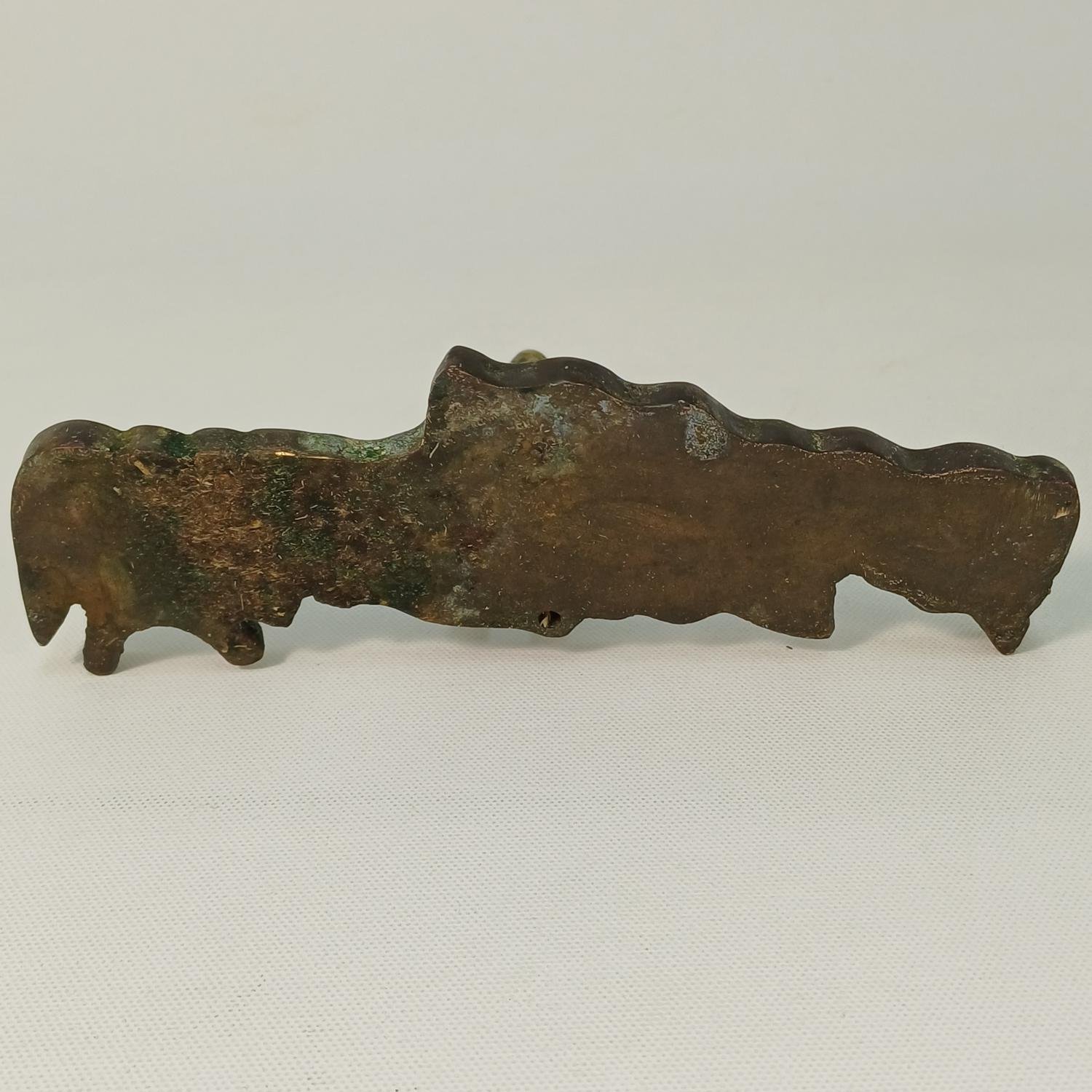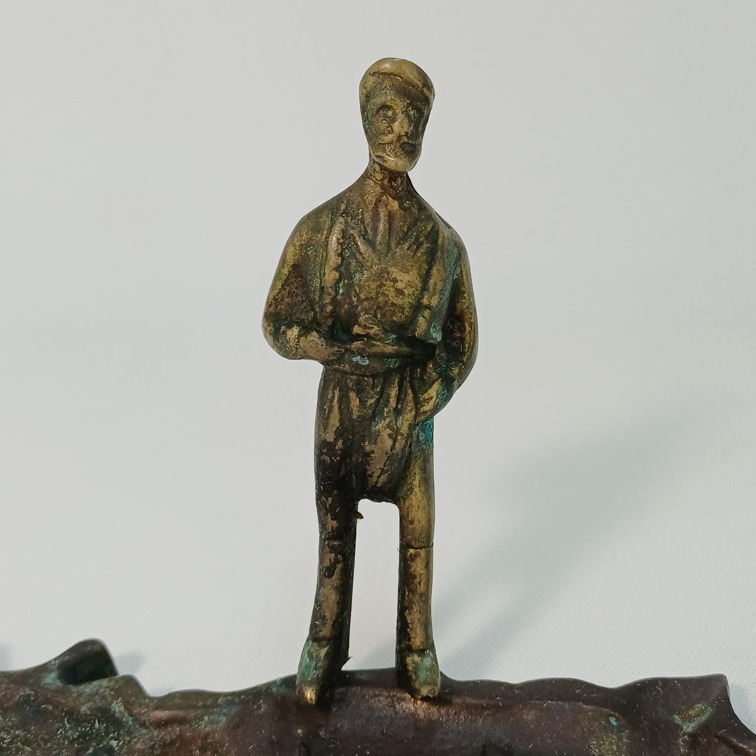 Μπρούτζινη θήκη-βάση πένας για γραφείο με θέμα το νησί της Κρήτης. Η θήκη έχει το σχήμα του νησιού της Κρήτης το οποίο φέρει ανάγλυφη Μυκηναϊκή μορφή τοιχογραφίας. Στο κέντρο στέκει όρθια μια ανδρική Κρητική φιγούρα. Το ύψος της φιγούρας είναι 10,5 cm και το μήκος της βάσης είναι 18 cm.