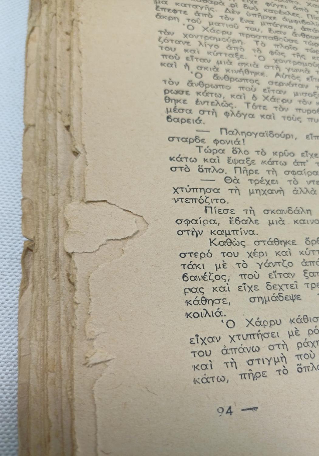 Το βιβλίο είναι μεταχειρισμένο με ορισμένες φθορές λόγω χρήσης και παλαιότητας. Φέρει μικρό σκίσιμο σε σελίδα.