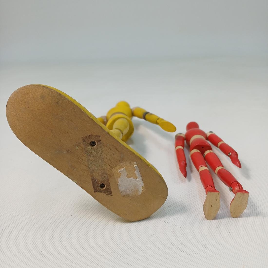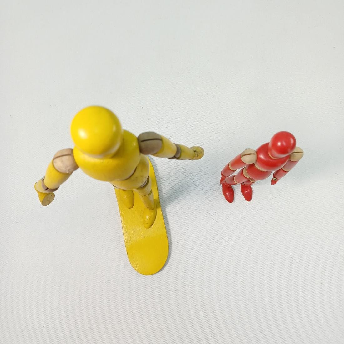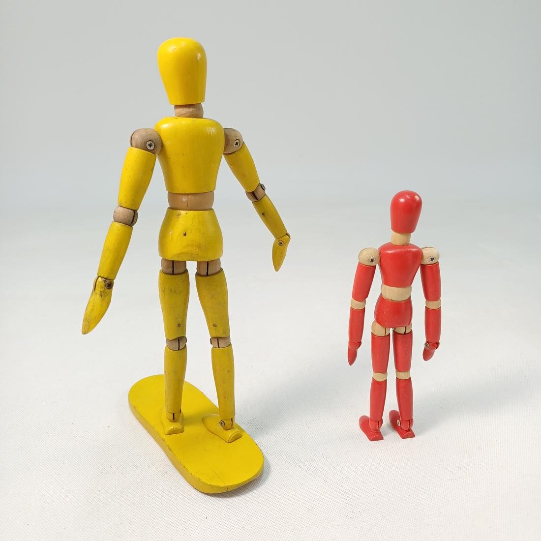 LOT 2 αρθρωτών ξύλινων καλλιτεχνικών μανεκέν σε κίτρινο και κόκκινο χρώμα