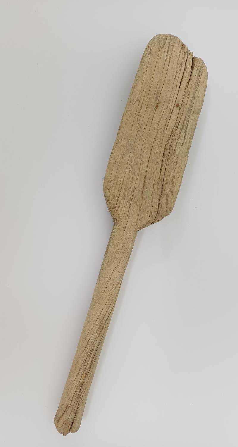 Ξύλινος παραδοσιακός κόπανος με τμήμα κρούσης σε σχήμα ορθογώνιου παραλληλόγραμμου και κυλινδρική, ενιαία λαβή. Χρονολογείται από την Επανάσταση έως τον εμφύλιο