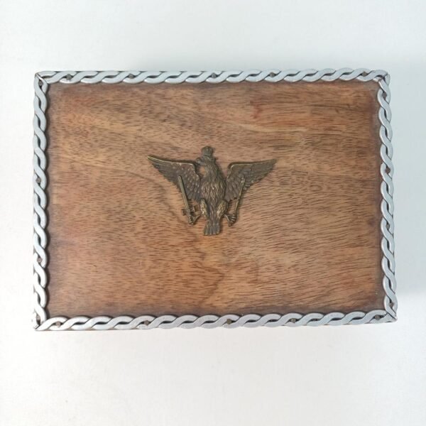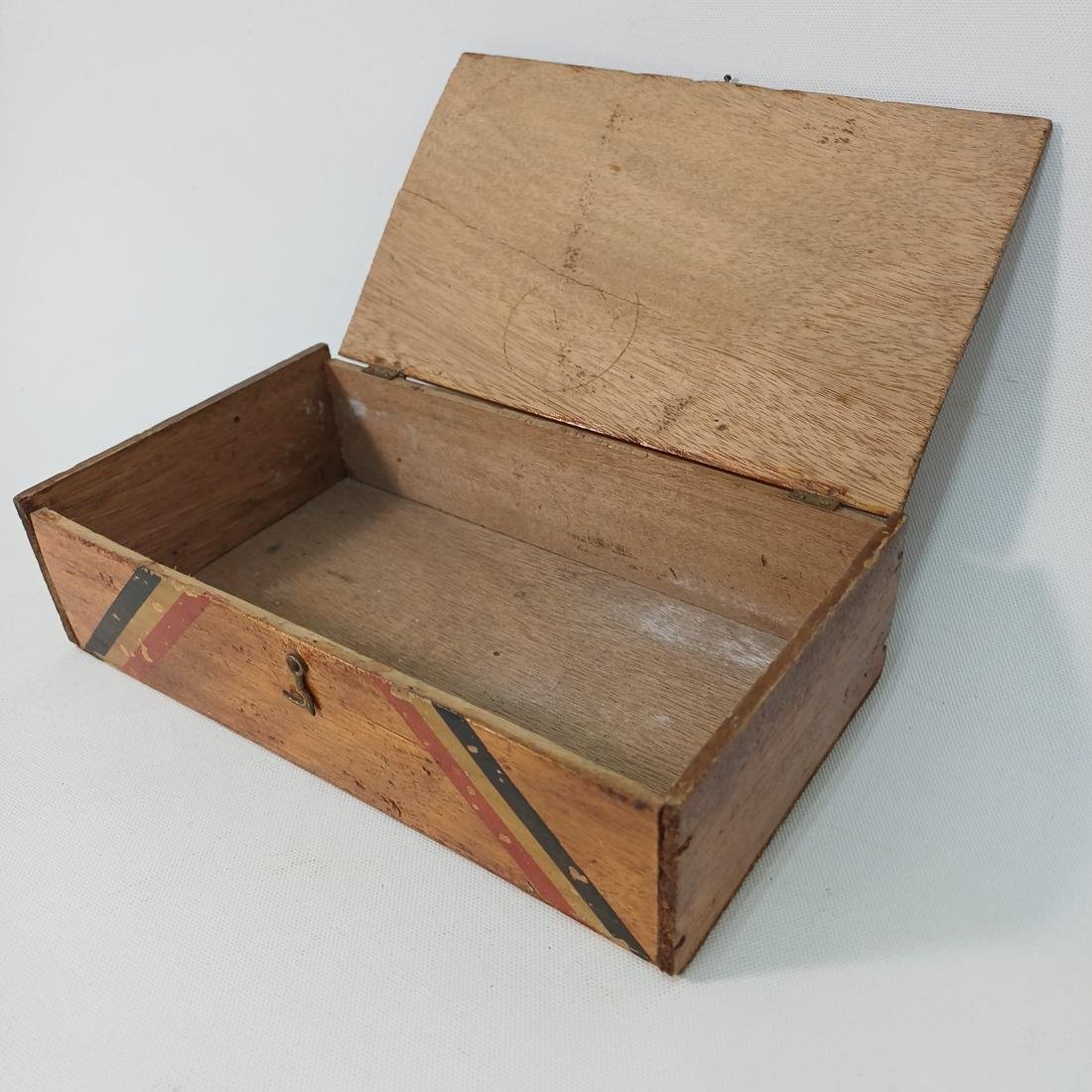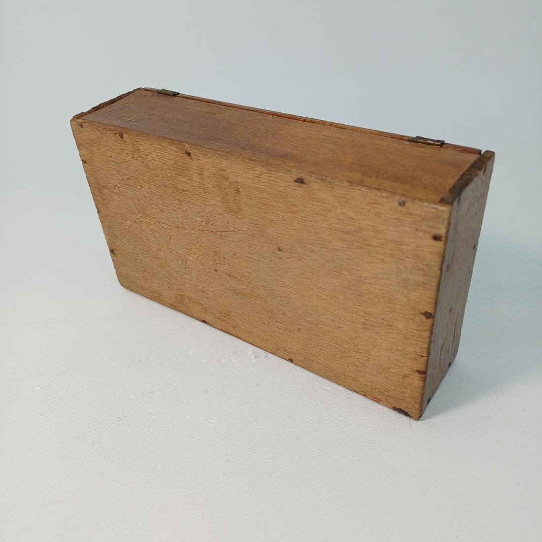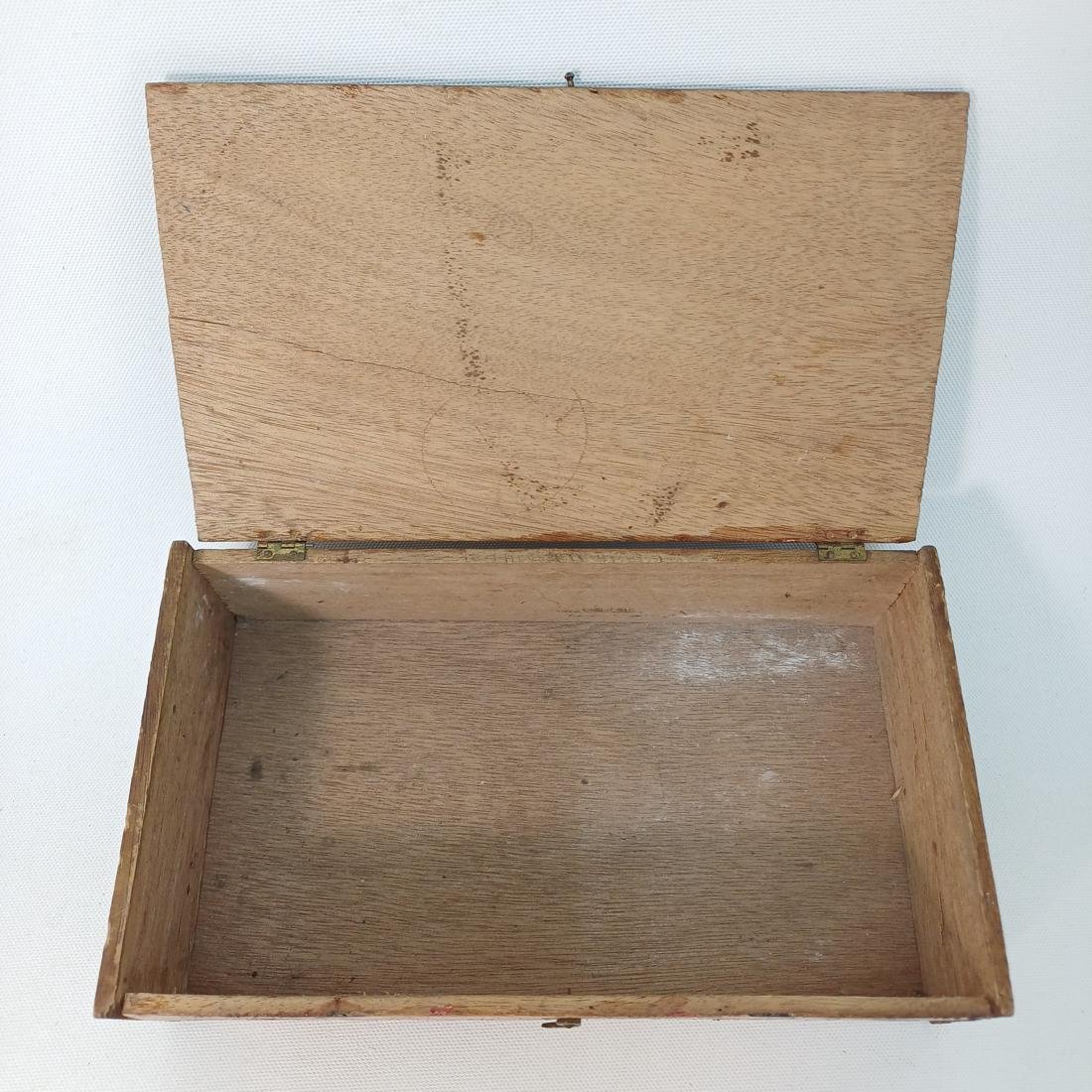 Οι διαστάσεις του κουτιού είναι 21,5 x 12,5 x 5,5 cm και το ξύλο στο καπάκι φέρει ρωγμή (σπάσιμο χωρίς αποκόλληση).