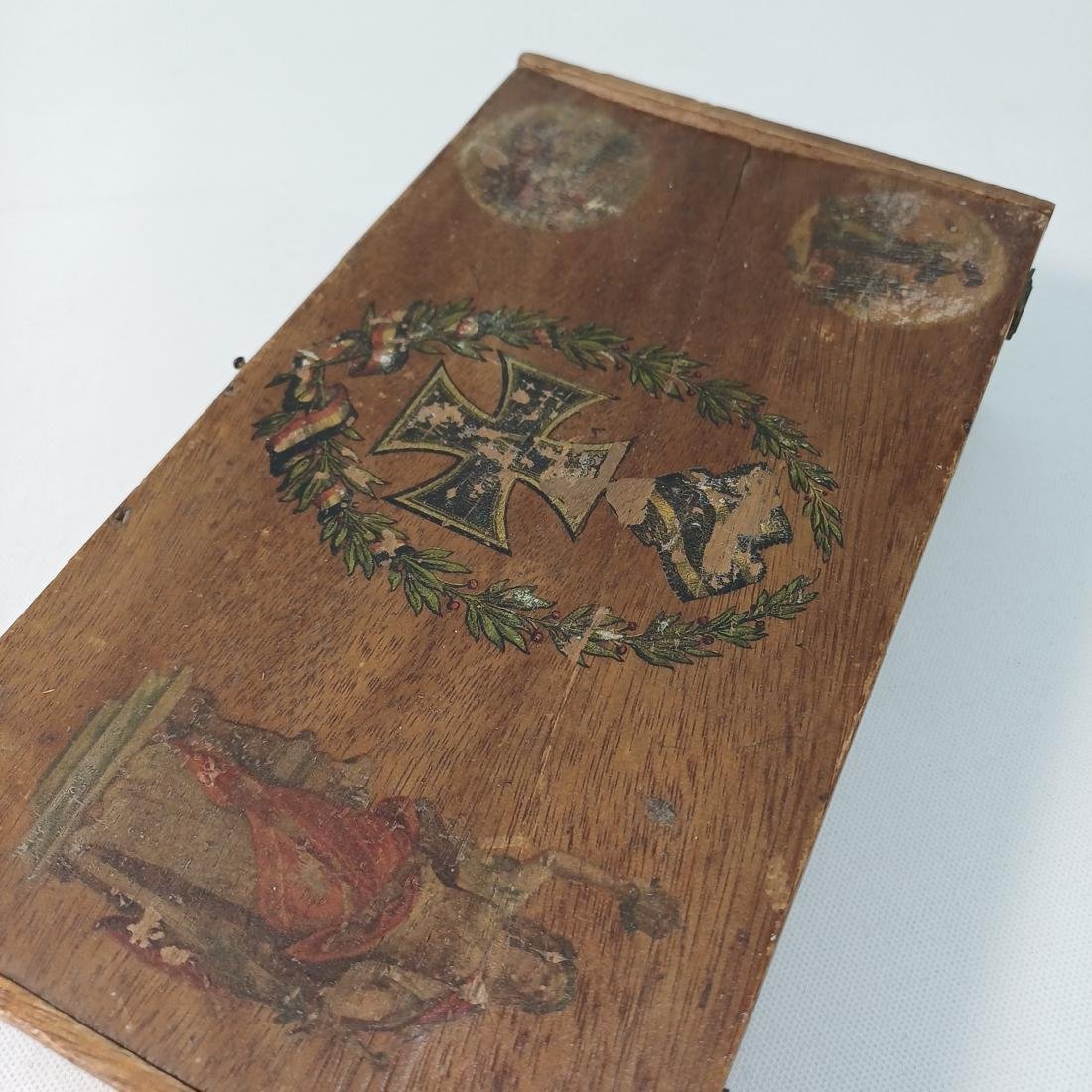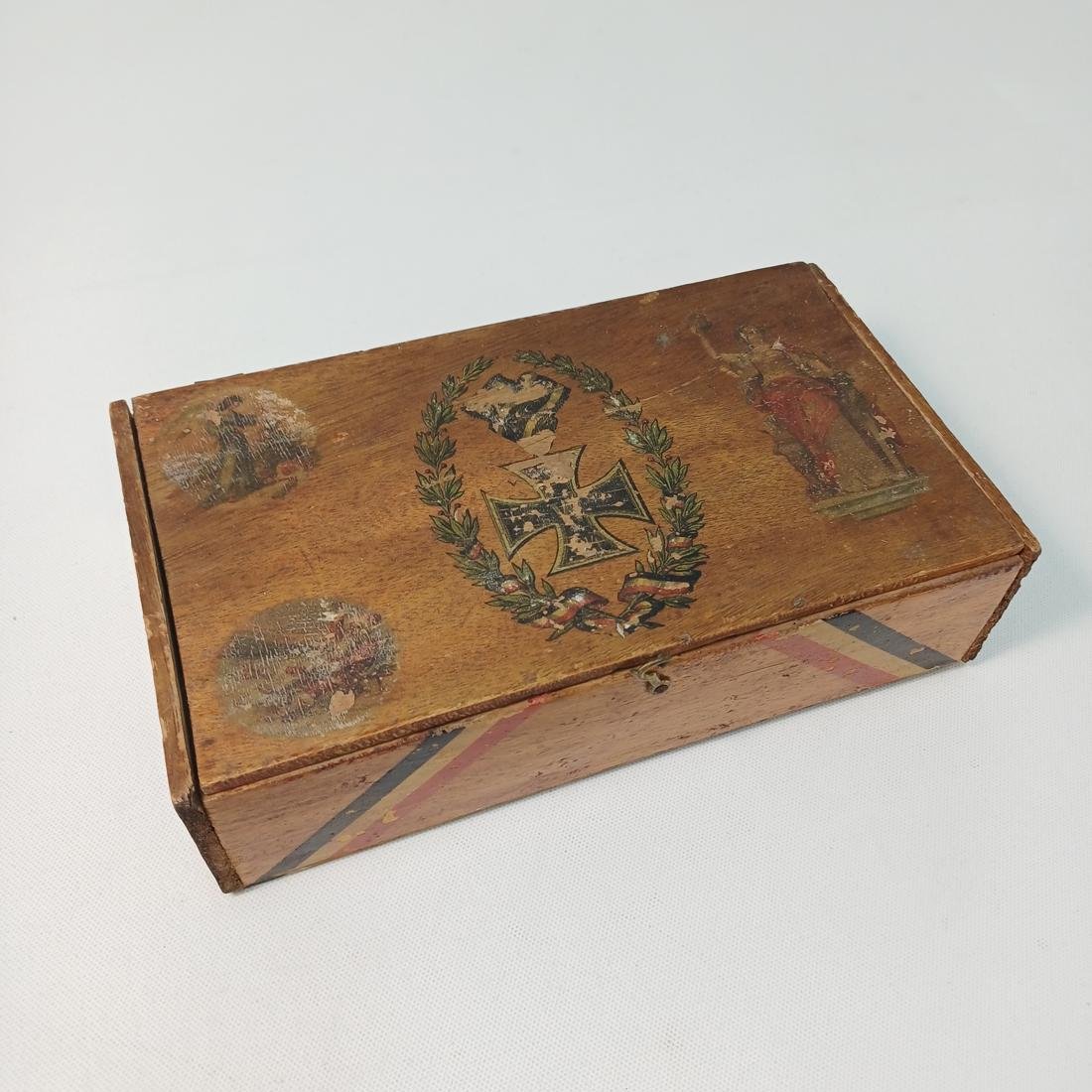 Ξύλινο Γερμανικό κουτί με το έμβλημα του Σιδηρού Σταυρού και τα χρώματα της Γερμανικής σημαίας. Χρονολογείται στην περίοδο του Α’ Παγκοσμίου πολέμου. Ο Σιδηρούς Σταυρός ήταν στρατιωτικό παράσημο της Γερμανίας, που χρησιμοποιήθηκε κυρίως κατά τον 19ο και 20ό αιώνα.