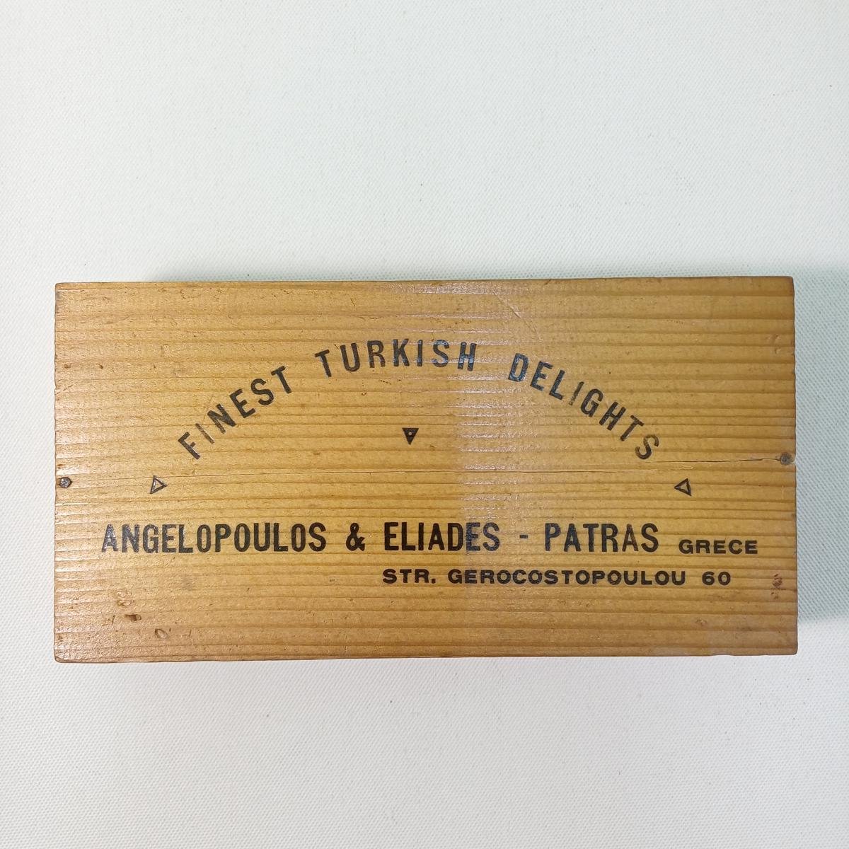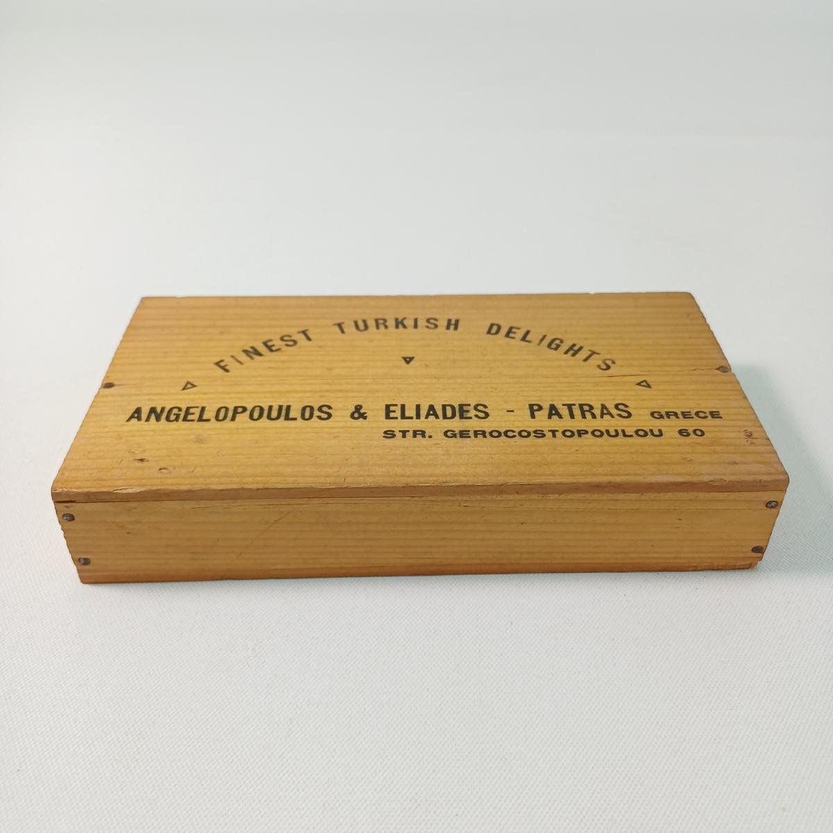 Ξύλινο κουτί με την επωνυμία “FINEST TURKISH DELIGHTS” (“Τα καλύτερα λουκούμια”) από την εταιρεία Angelopoulos & Eliades, η οποία βρισκόταν στην Πάτρα.