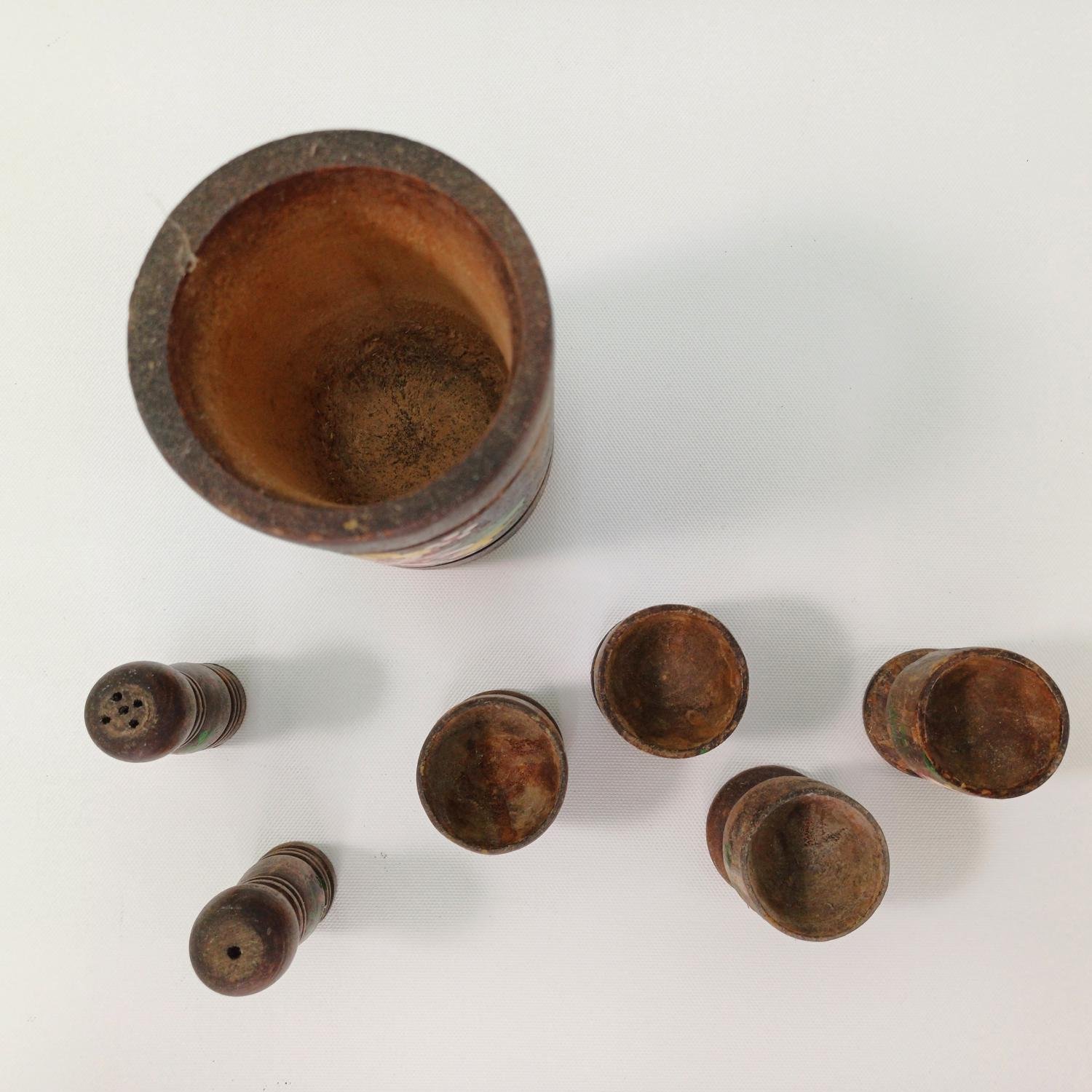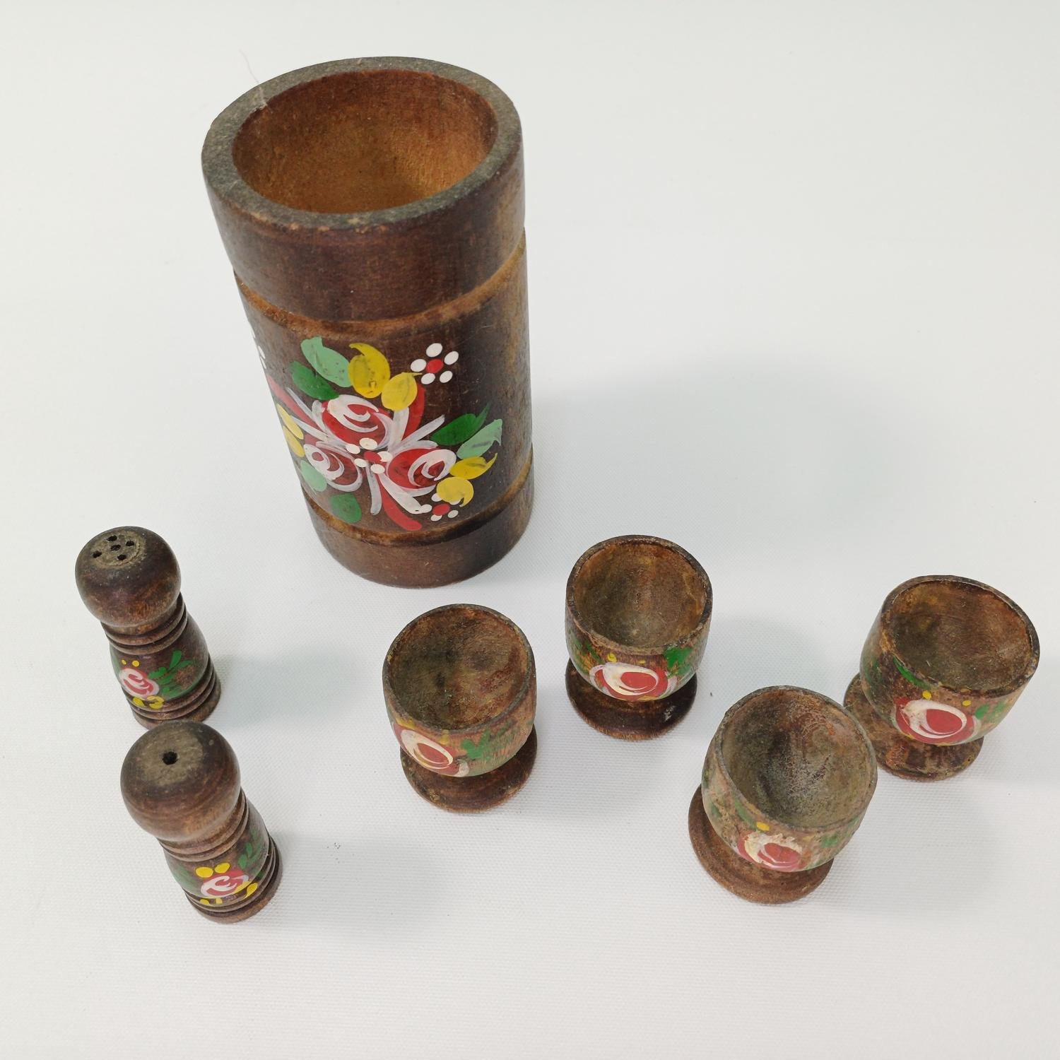 Σετ 7 ξύλινων τεμαχίων ζωγραφισμένων στο χέρι. Ένα ξύλινο δοχείο, 4 αυγοθήκες και δοχεία αλατοπίπερου.