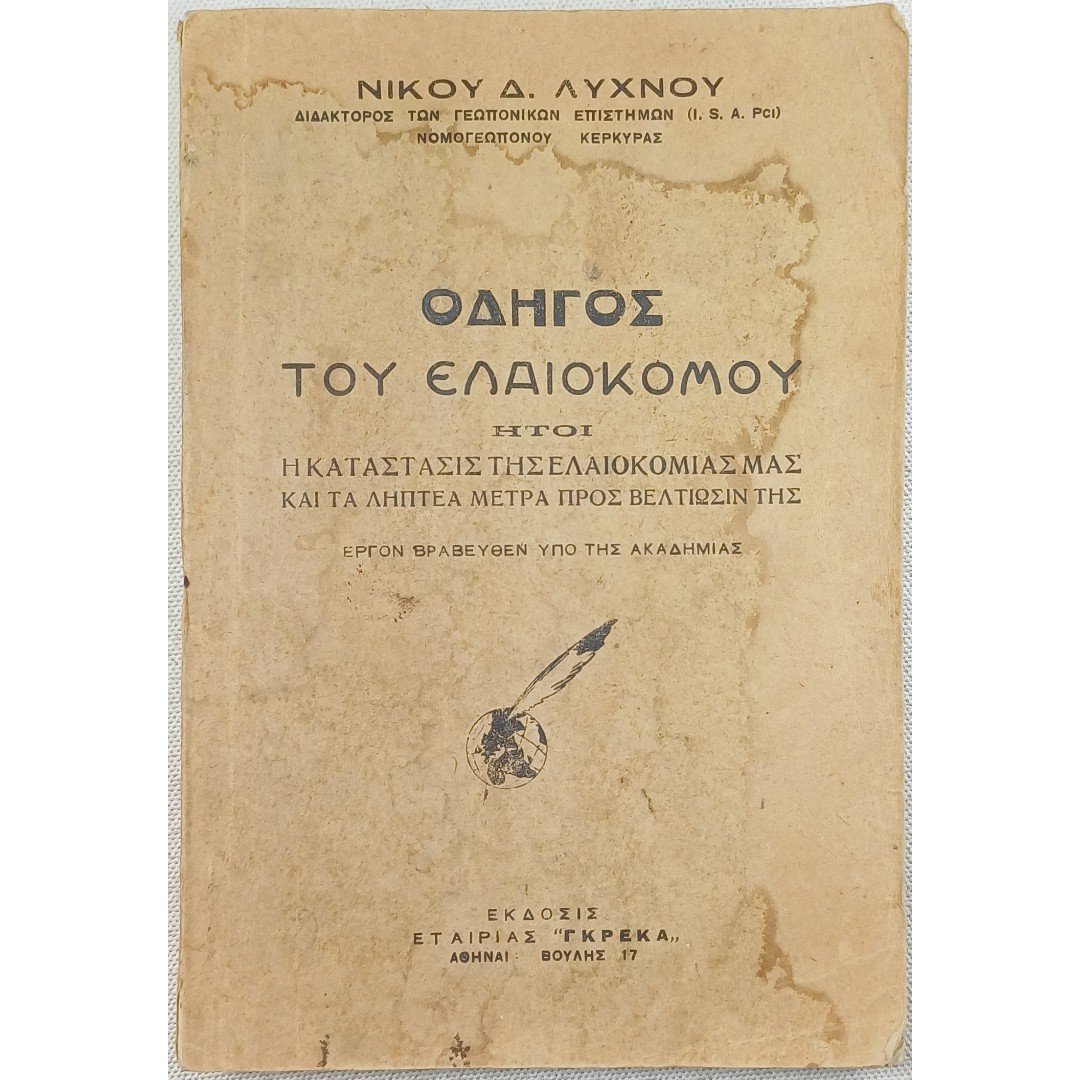 Το δυσεύρετο βιβλίο “Οδηγός του Ελαιοκόμου: ήτοι η κατάστασις της ελαιοκομίας μας και τα ληπτέα μέτρα προς βελτίωσιν της” γράφτηκε από τον Νίκο Δ. Λύχνο, διδάκτορα των γεωπονικών επιστημών και νομογεωπόνο Κέρκυρας, αποτελεί έργο βραβευθέν από την Ακαδημία. Το έργο αυτό πραγματεύεται την κατάσταση της ελαιοκομίας στην Ελλάδα και προτείνει τα απαραίτητα μέτρα για τη βελτίωσή της.