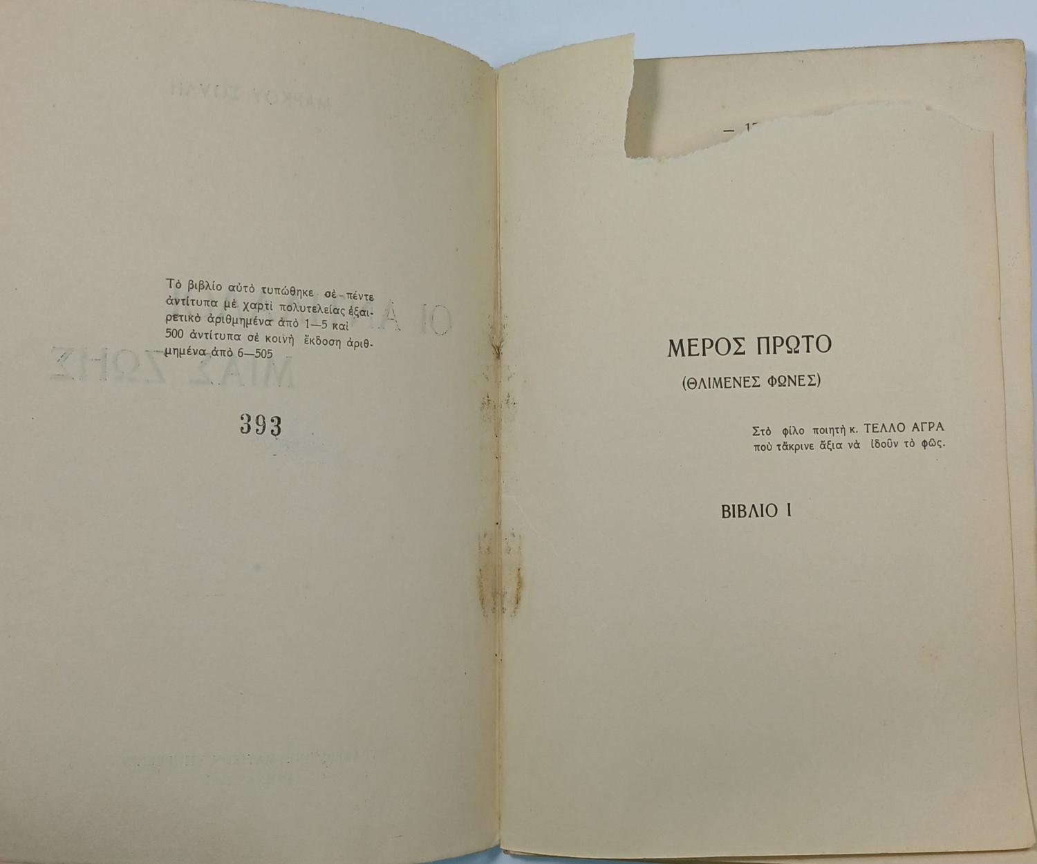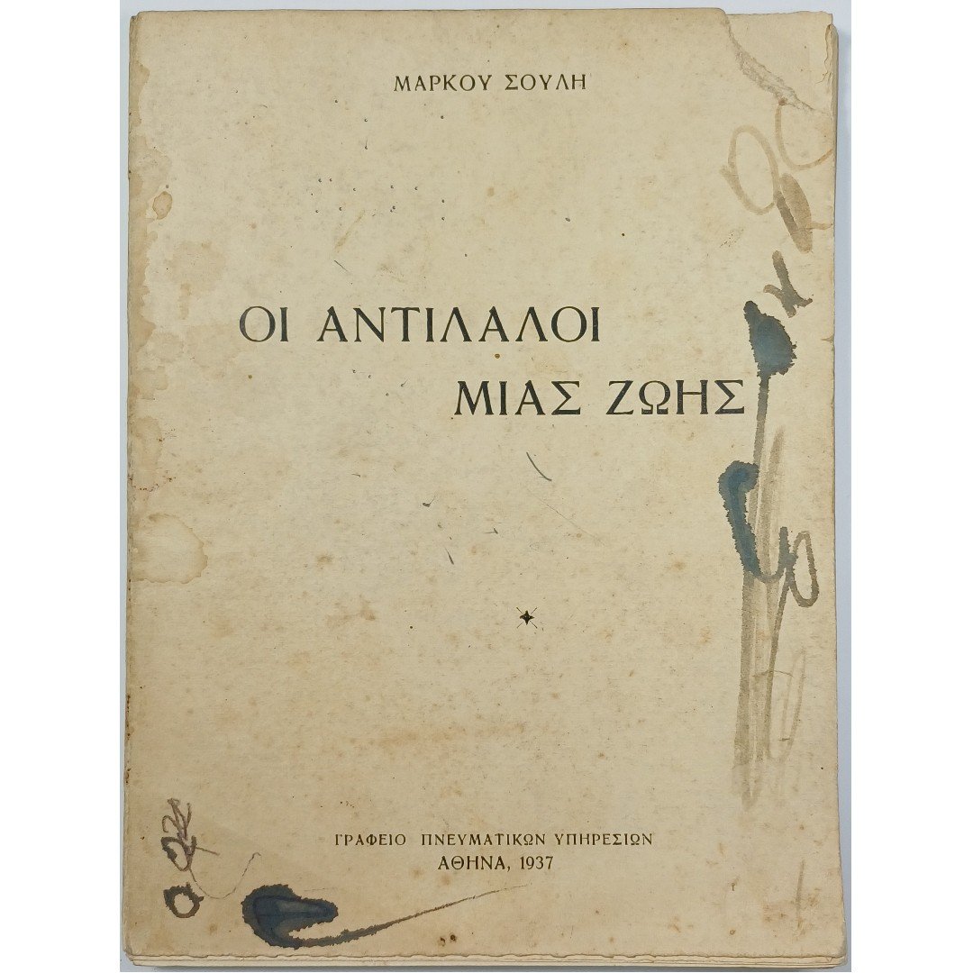 Σπάραγμα. Το βιβλίο “Οι Αντίλαλοι μιας Ζωής” είναι μια σπάνια ποιητική συλλογή του Μάρκου Σούλη, η οποία εκδόθηκε στην Αθήνα το 1937 από το “Γραφείο Πνευματικών Υπηρεσιών”. Η έκδοση αποτελείται από 96 σελίδες και κυκλοφόρησε σε περιορισμένο αριθμό 500 αριθμημένων αντιτύπων. Το συγκεκριμένο αντίτυπο φέρει τον αύξοντα αριθμό 393.