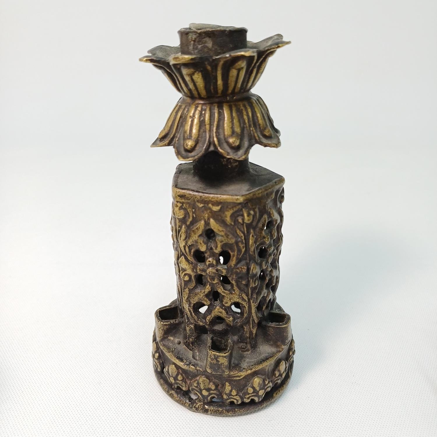 Ορειχάλκινο Κινεζικό κηροπήγιo με Foo Dogs, 5 τεμαχίων. Αποτελείται από ένα κεντρικό κηροπήγιο που έχει μικρές θήκες στη βάση του για να μπαίνουν οι ουρές των 4 κηροπήγιων Foo Dogs που το περιβάλλουν. Τα κινέζικα Foo Dogs, γνωστά και ως Λιοντάρια-Φύλακες, είναι παραδοσιακά κινεζικά αρχιτεκτονικά στολίδια και τα οποία πιστεύεται ότι έχουν προστατευτικές δυνάμεις. Τα Foo Dogs έχουν μακρά ιστορία στην κινεζική κουλτούρα και συνήθως τοποθετούνται στην είσοδο κτιρίων για να διώχνουν τα κακά πνεύματα. Ο περίπλοκος σχεδιασμός αντανακλά την παραδοσιακή κινεζική δεξιοτεχνία.