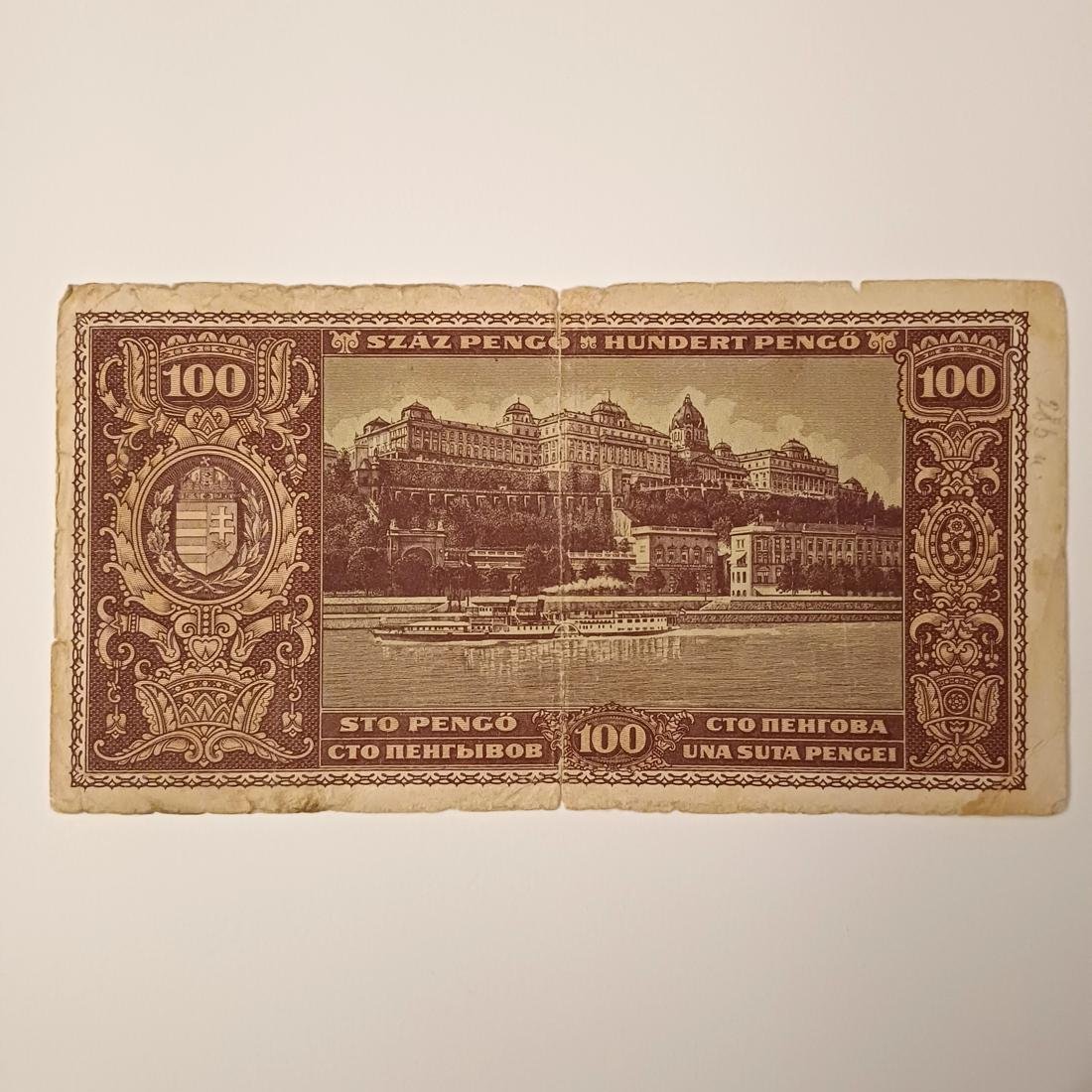 Ουγγρικό χαρτονόμισμα των 100 Pengő, με ημερομηνία έκδοσης την 5η Απριλίου 1945, μεταπολεμικής περιόδου. Εκδόθηκε από την Εθνική Τράπεζα της Ουγγαρίας (Magyar Nemzeti Bank) και φέρει στη δεξιά του πλευρά τη μορφή του Βασιλιά Ματθαίου Κορβίνου (King Mátyás). Η κυκλοφορία του ξεκίνησε τον Μάιο του 1945 και διήρκεσε μόλις έναν χρόνο, καθώς αποσύρθηκε τον Μάιο του 1946 λόγω του ακραίου υπερπληθωρισμού που έπληξε τη χώρα μετά τον Β’ Παγκόσμιο Πόλεμο, οδηγώντας στην αντικατάσταση του νομίσματος από το Φιορίνι.
