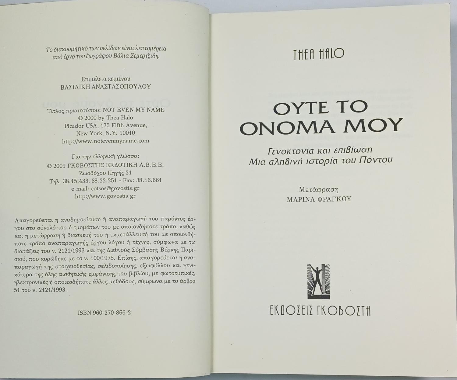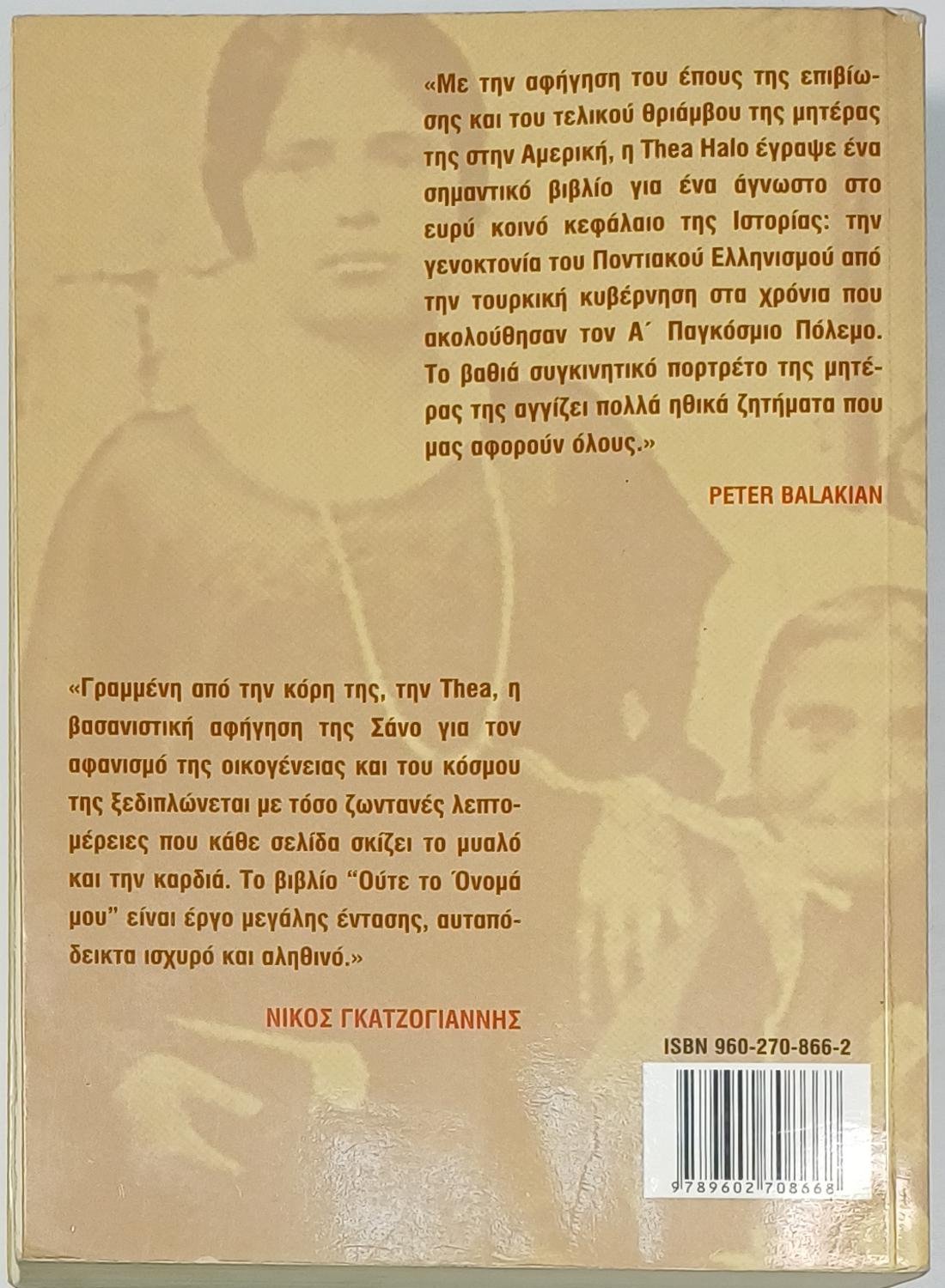 Το βιβλίο «Ούτε το όνομά μου» της Thea Halo καταγράφει τη συγκλονιστική, αληθινή ιστορία επιβίωσης της μητέρας της, Σάνο Χάλο, από τη γενοκτονία των Ελλήνων του Πόντου κατά τη διάρκεια του Α’ Παγκοσμίου Πολέμου. Η αφήγηση περιγράφει πώς η Σάνο, σε ηλικία μόλις 10 ετών, ξεριζώθηκε από το χωριό της και οδηγήθηκε σε μαρτυρικές πορείες θανάτου, όπου έχασε όλη την οικογένειά της, και πώς τελικά σώθηκε, παντρεύτηκε και δημιούργησε μια νέα ζωή στην Αμερική. Πρόκειται για μια σπάνια μαρτυρία αυτόπτη μάρτυρα για τα φρικτά γεγονότα μιας ελάχιστα γνωστής και συχνά αρνούμενης γενοκτονίας, η οποία αποτελεί μια σημαντική προσωπική ιστορία για τη μνήμη και την τιμή του παρελθόντος.