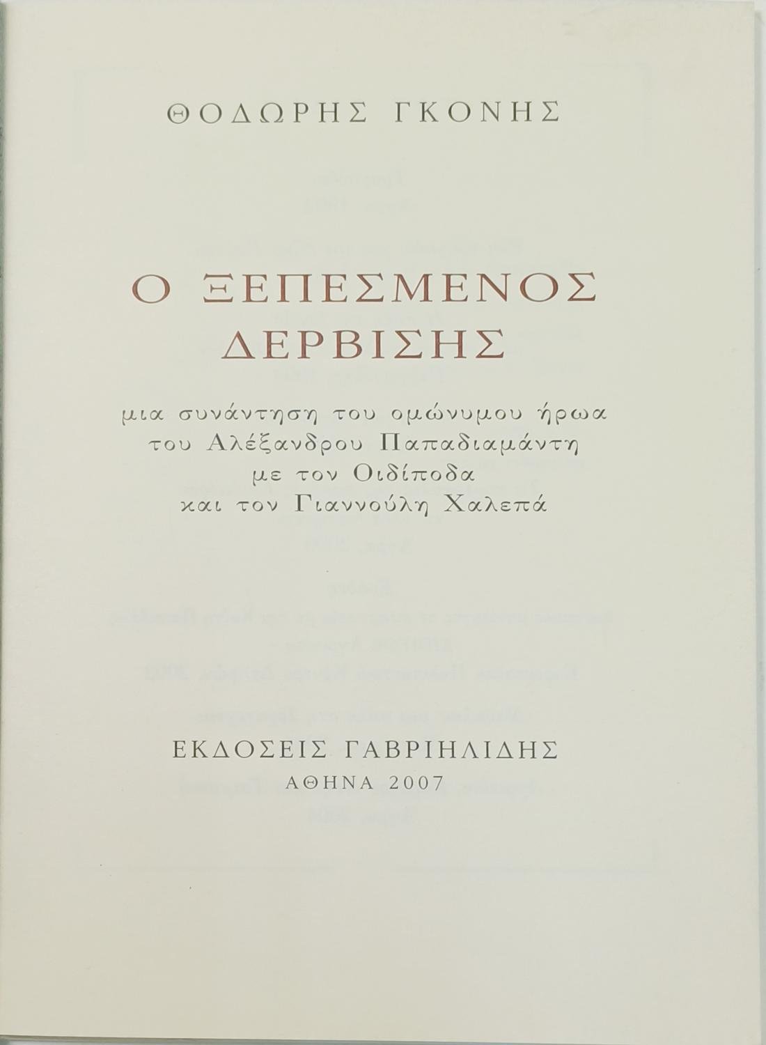 Το βιβλίο «Ο ξεπεσμένος δερβίσης» του Θοδωρή Γκόνη είναι ένα θεατρικό έργο που φέρνει στη σκηνή τρεις εμβληματικές μορφές: τον ανέστιο και πλάνητα δερβίση από το ομώνυμο διήγημα του Παπαδιαμάντη, τον τραγικό βασιλιά Οιδίποδα από τον Σοφοκλή και τον σπουδαίο γλύπτη Γιαννούλη Χαλεπά. Το έργο δεν αποτελεί απλώς μια διασκευή του παπαδιαμαντικού κειμένου, αλλά μια πρωτότυπη σύνθεση, όπου οι τρεις ήρωες συναντιούνται σε έναν μυστικό τόπο, διερευνώντας θέματα όπως η μοίρα, η εξιλέωση, η τρέλα, και η αναζήτηση της πνευματικής ελευθερίας. Μέσα από τους διαλόγους τους, ο Γκόνης επιχειρεί να γεφυρώσει διαφορετικούς κόσμους και εποχές, προσδίδοντας σύγχρονες διαστάσεις στους κλασικούς χαρακτήρες και αναδεικνύοντας τις κοινές τους αγωνίες γύρω από την ανθρώπινη ύπαρξη και τη σωτηρία της ψυχής.