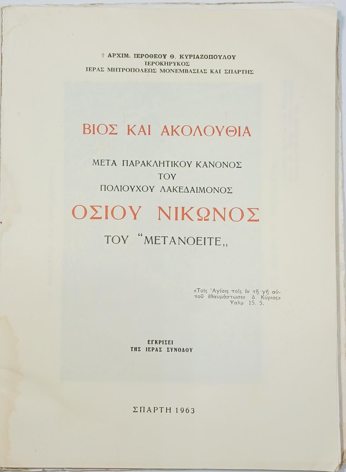 “Ο Όσιος Νίκων Ο «Μετανοείτε»” Αρχιμανδρίτης Ιερόθεος Κυριαζόπουλος Ιεροκήρυκας (1963)