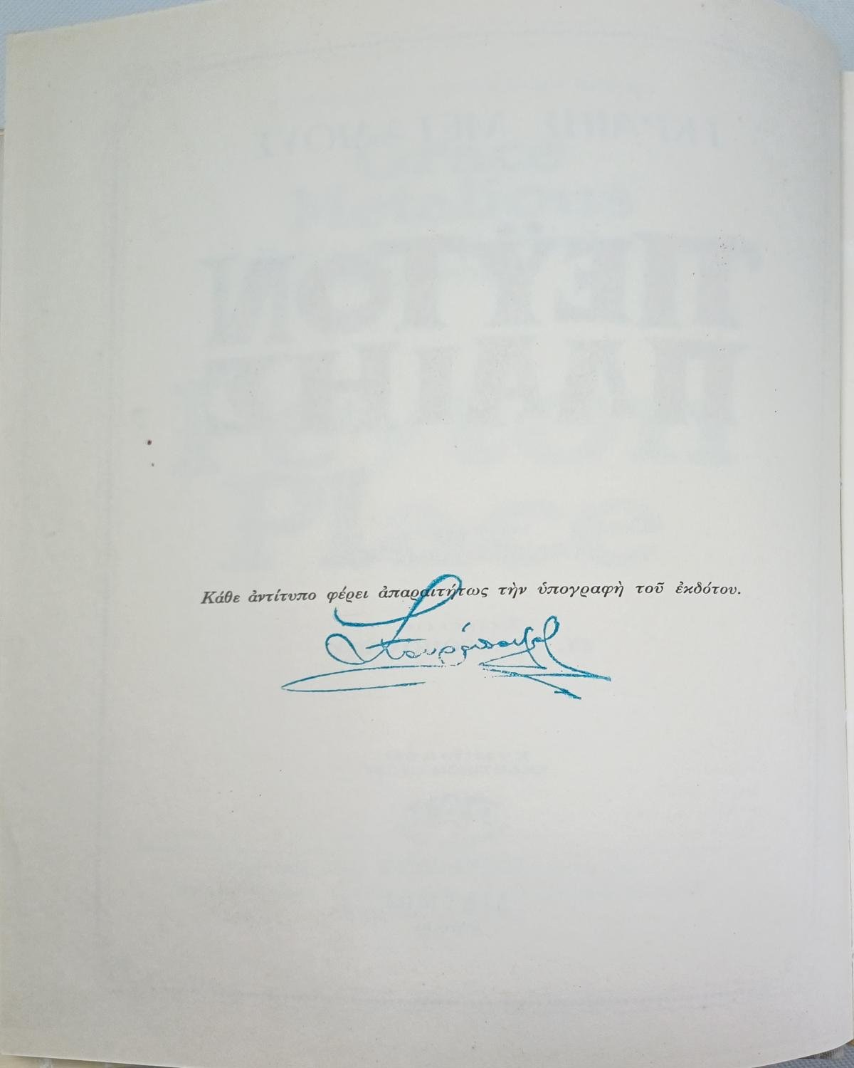 Το βιβλίο είναι κάπως φθαρμένο μαζί με το περικάλυμμά του λόγω χρήσης και παλαιότητας. Υπάρχει υπογραφή που αποδεικνύει τη γνησιότητα του αντιτύπου.