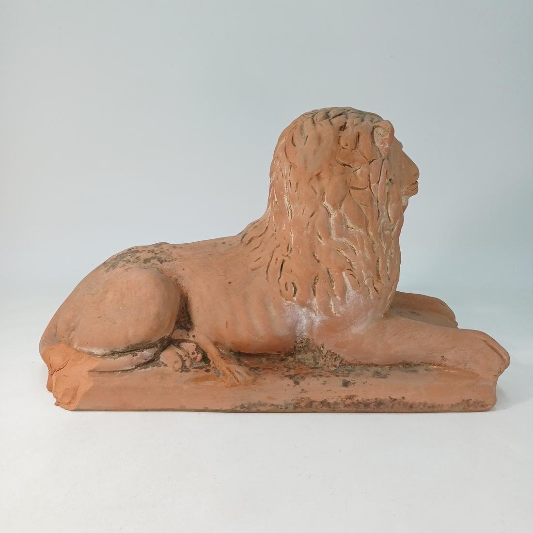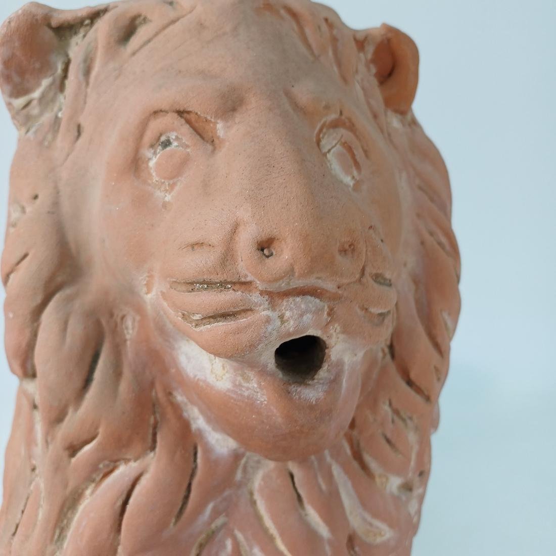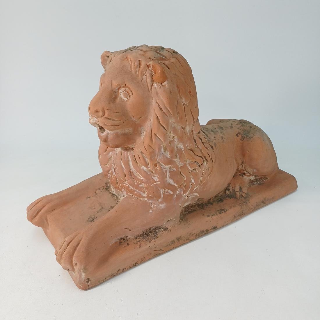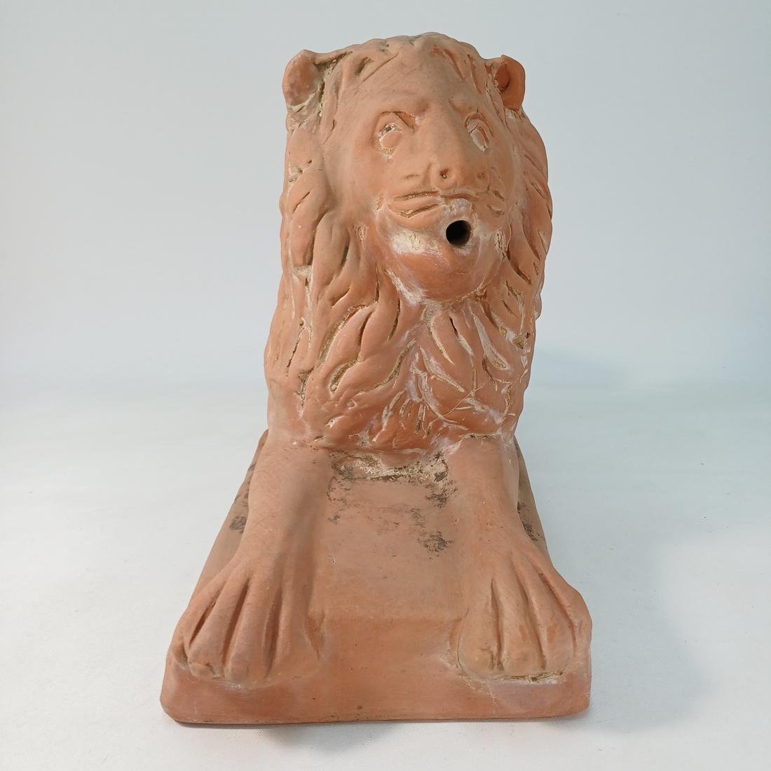 Πήλινο λιοντάρι το οποίο χρησιμοποιούνταν ως διακοσμητικό ακροκέραμο. Φέρει σημάδια έκθεσης σε εξωτερικό χώρο και οι διαστάσεις του είναι 51 * 20,5 * 33 cm.