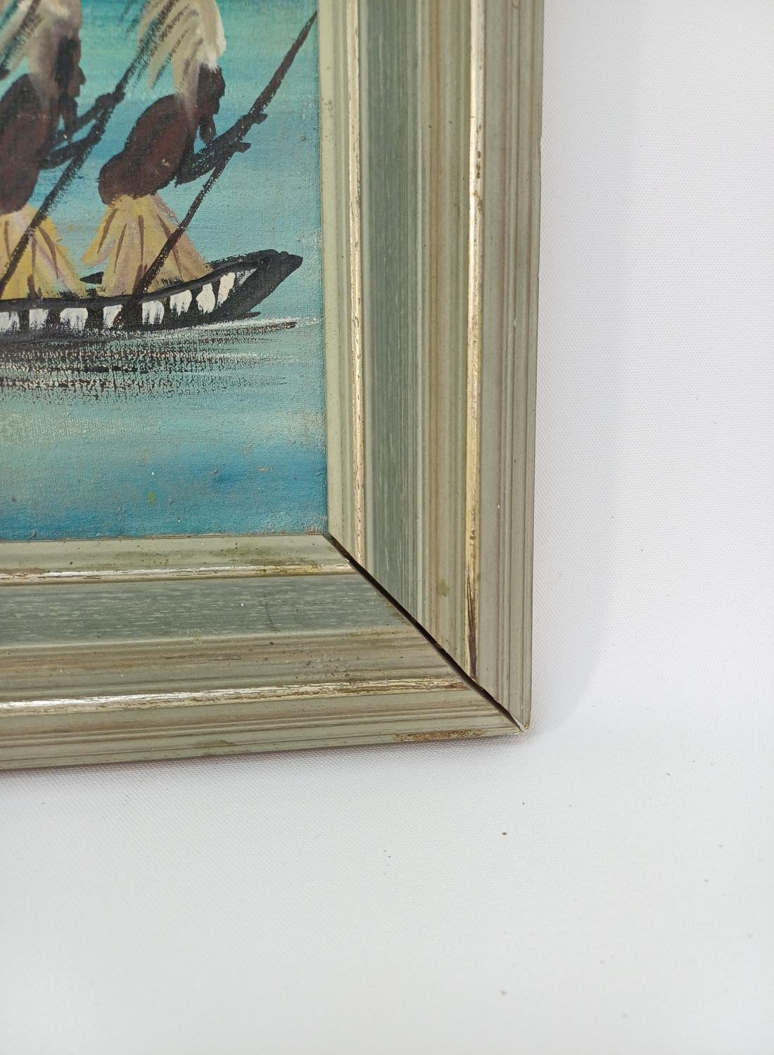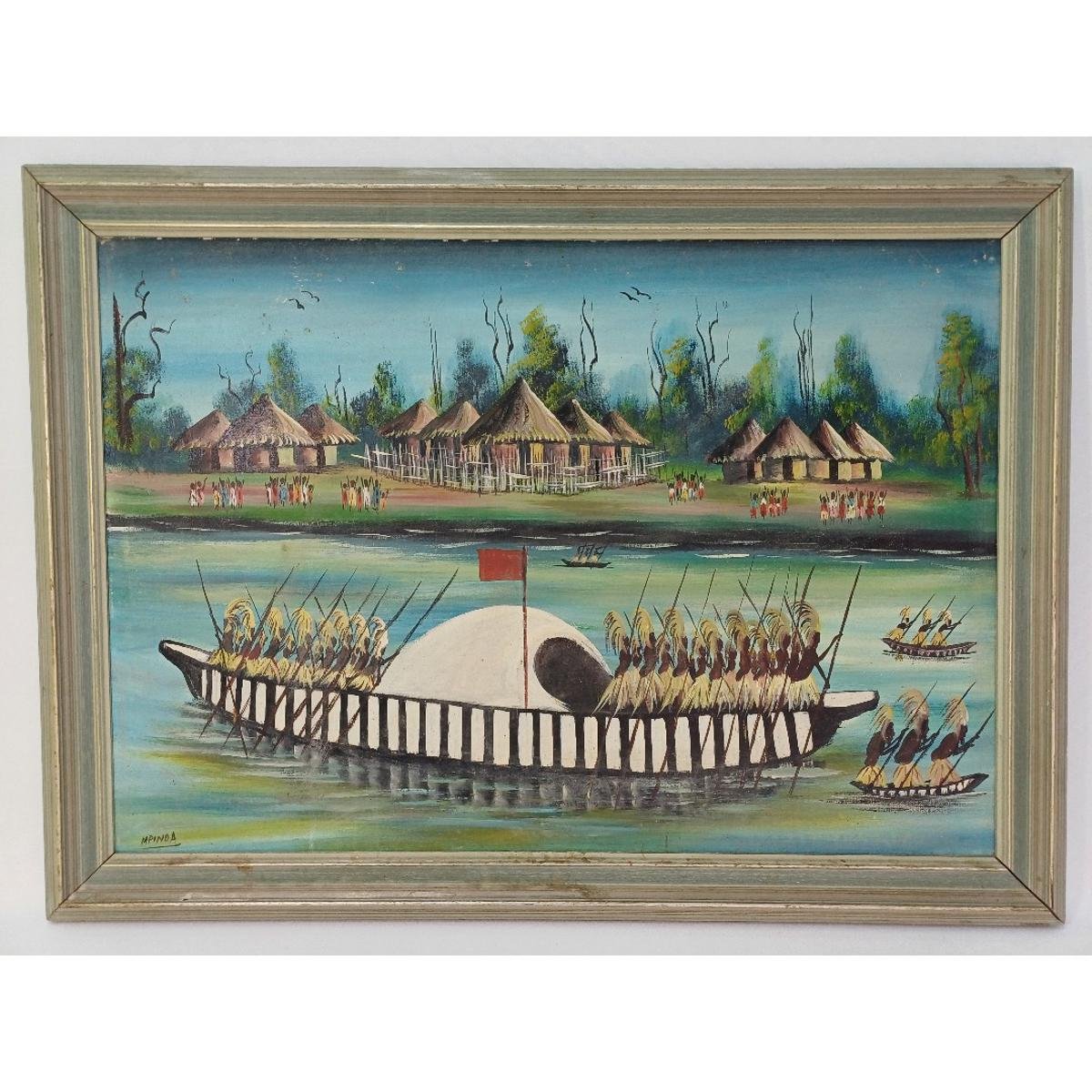 Πίνακας ζωγραφικής σε κορνίζα, ο οποίος απεικονίζει ένα παραδοσιακό Αφρικανικό χωριό και ένα πλωτό καράβι με Αφρικανούς πολεμιστές. Φέρει υπογραφή με το όνομα “MPINDA”