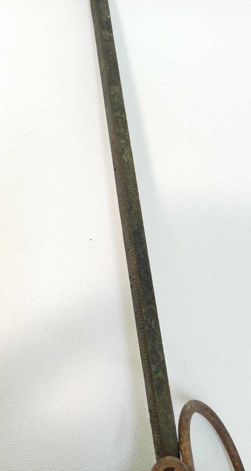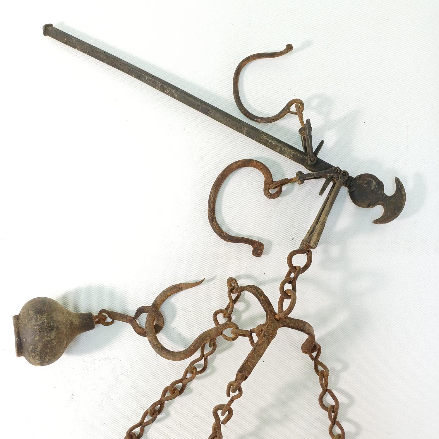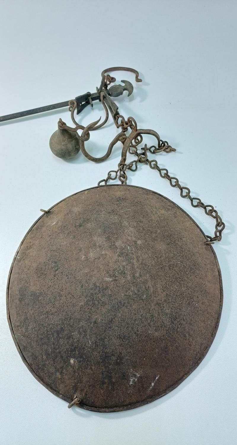 Η διάμετρος του δίσκου είναι 30 cm και το ύψος της κρεμασμένης ζυγαριάς μέχρι τον βραχίονα είναι 60 cm. Υπάρχει εμφανής σκουριά στο μέταλλο λόγω παλαιότητας.
