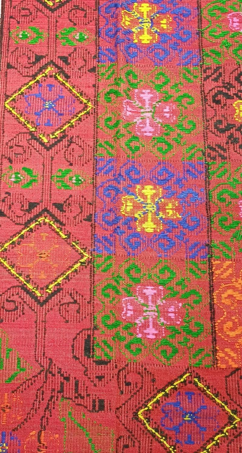 Παραδοσιακό υφαντό κάλυμμα διθέσιου καναπέ ή μονού/ημίδιπλου κρεβατιού, διαστάσεων 1,70 * 2,35 m, με πολύχρωμα μοτίβα σε κόκκινο φόντο