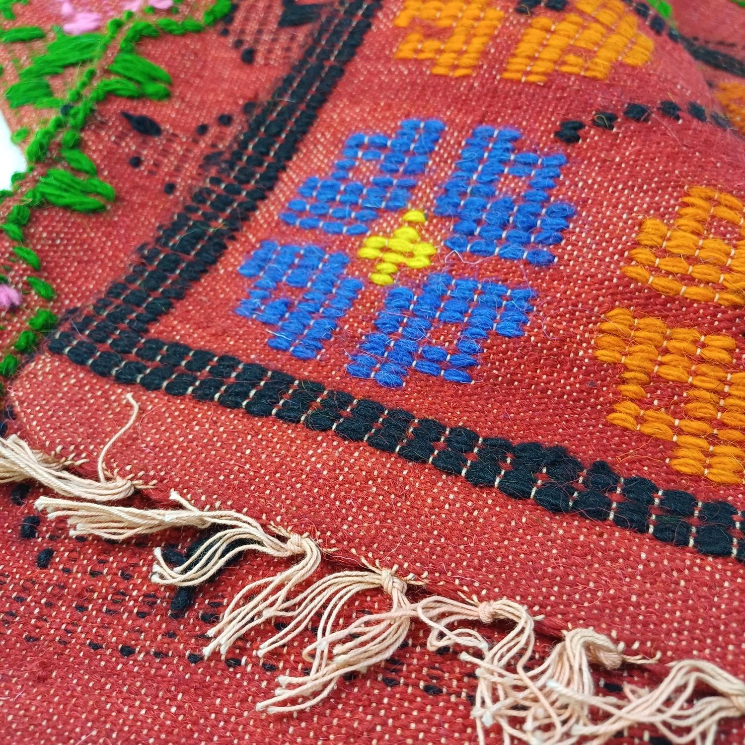 Μεταχειρισμένο, παραδοσιακό υφαντό κάλυμμα διθέσιου καναπέ ή μονού/ημίδιπλου κρεβατιού, διαστάσεων 1,70 * 2,35 m, με πολύχρωμα μοτίβα σε κόκκινο φόντο. Έχει κρόσσια και στις δυο πλευρές (της διάστασης του 1,70 m) με φθορές λόγω παλαιότητας.