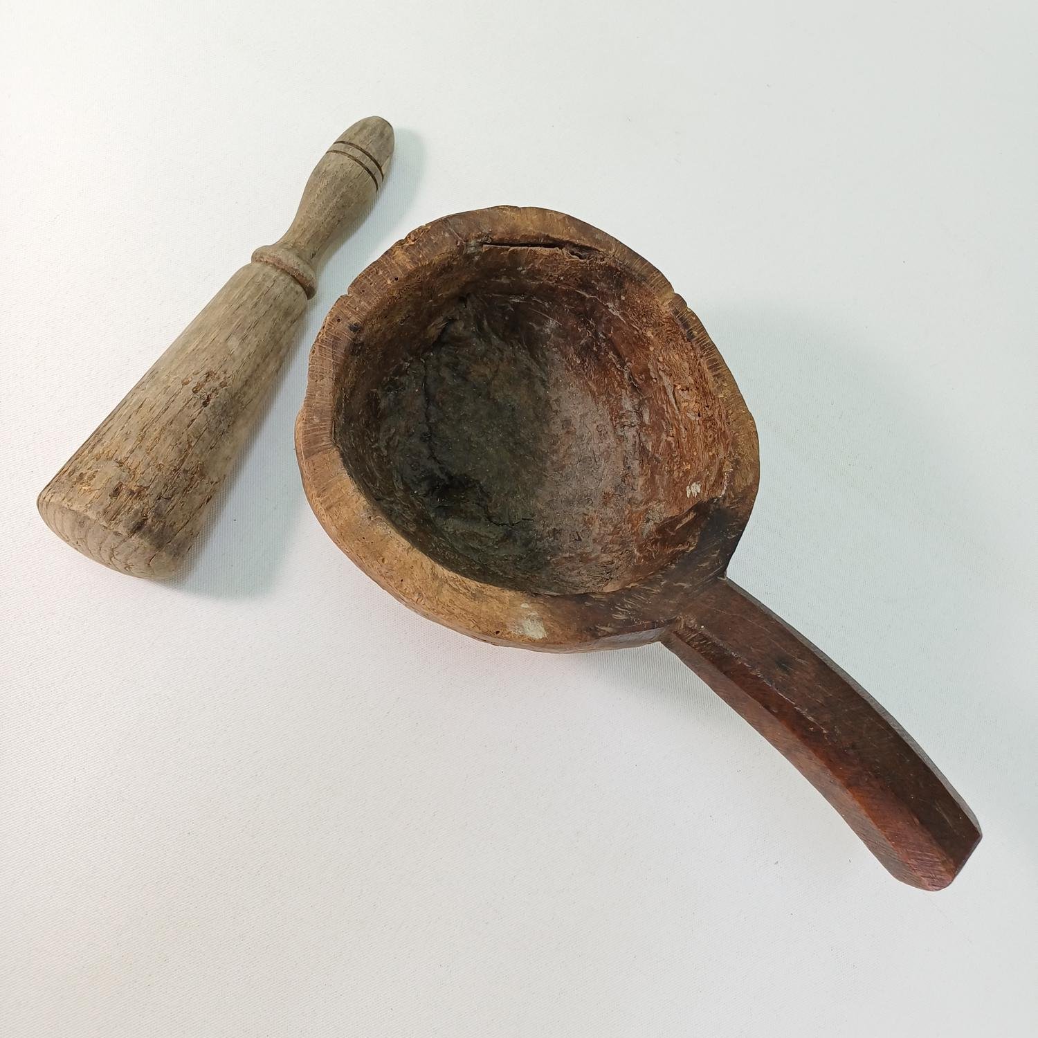 Παραδοσιακό ξύλινο γουδί με χερούλι σκαλισμένο στο χέρι, με το γουδοχέρι του