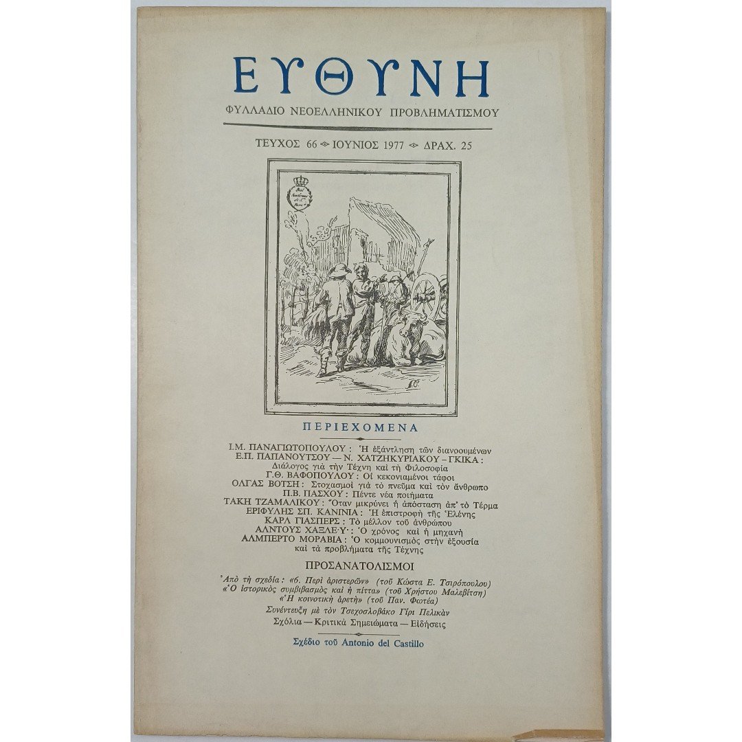 Το τεύχος 66 του περιοδικού «ΕΥΘΥΝΗ», με ημερομηνία κυκλοφορίας τον Ιούνιο του 1977, είναι ένα «Φυλλάδιο Νεοελληνικού Προβληματισμού» που συγκεντρώνει κείμενα και προβληματισμούς γύρω από την τέχνη, τη φιλοσοφία και κοινωνικοπολιτικά θέματα της εποχής. Περιλαμβάνει άρθρα, μελέτες και ποιήματα από σημαντικούς Έλληνες και ξένους διανοούμενους, όπως οι Ι.Μ. Παναγιωτόπουλος, Ε.Π. Παπανούτσος, Όλγα Βότση, Καρλ Γιάσπερς, Άλντους Χάξλεϋ και Αλμπέρτο Μοράβια, καλύπτοντας ένα ευρύ φάσμα θεμάτων, από την εξάντληση των διανοουμένων και τον διάλογο για την τέχνη μέχρι το μέλλον του ανθρώπου και τον κομμουνισμό στην εξουσία.