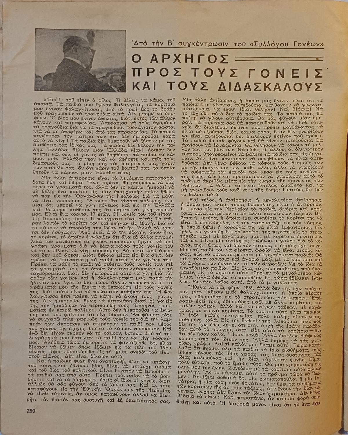 Το παρόν τεύχος περιέχει ομιλία του Ιωάννου Μεταξά προς τους γονείς και τους διδασκάλους (από τη Β’ Συγκέντρωση του Συλλόγου Γονέων), φωτογραφικό υλικό από Συνδιασκέψεις και εκδηλώσεις καθώς και απόσπασμα του μυθιστορήματος ‘Χωρίς Οικογένεια΄ του Hector Malot.